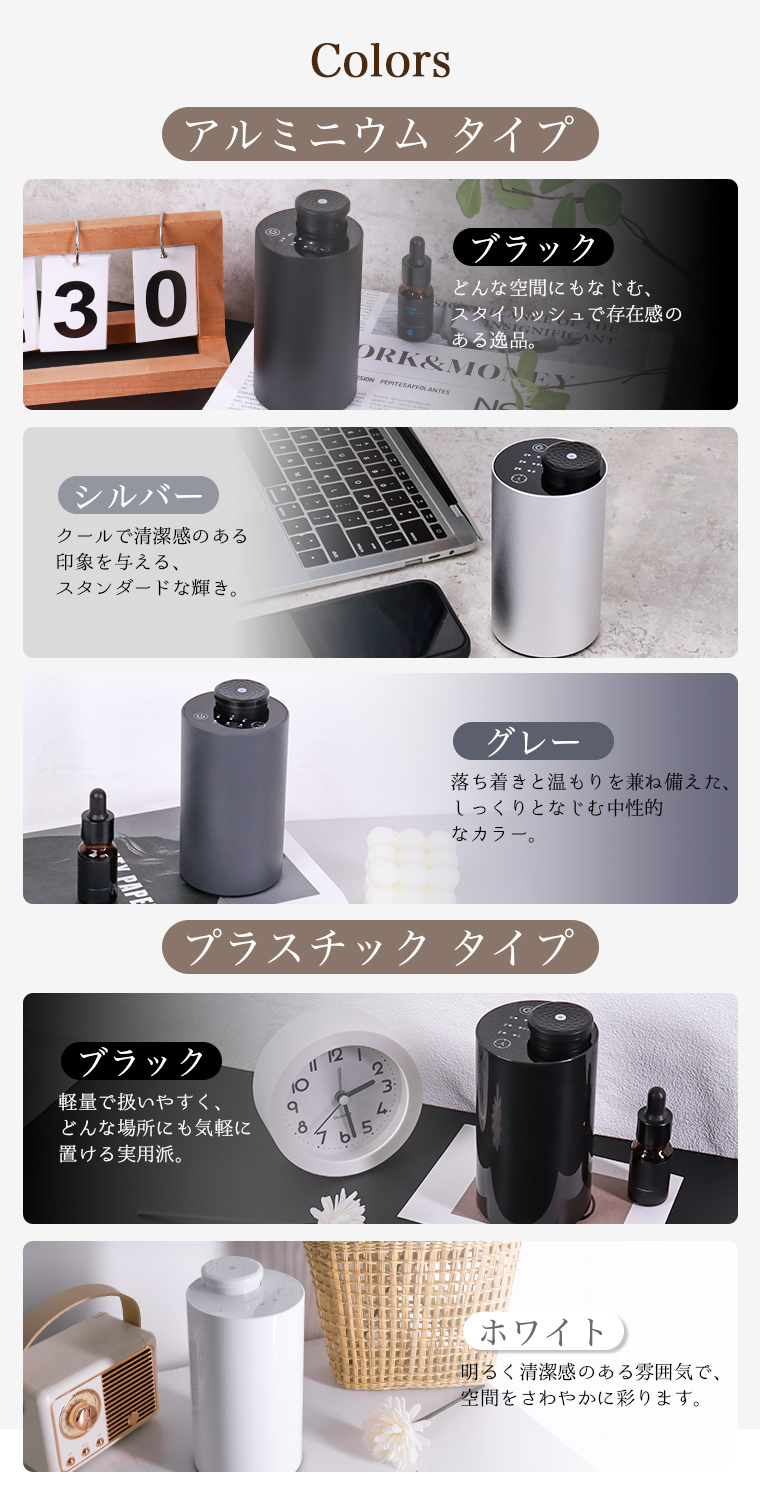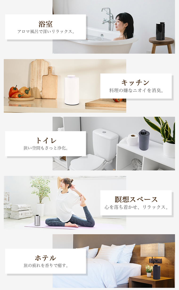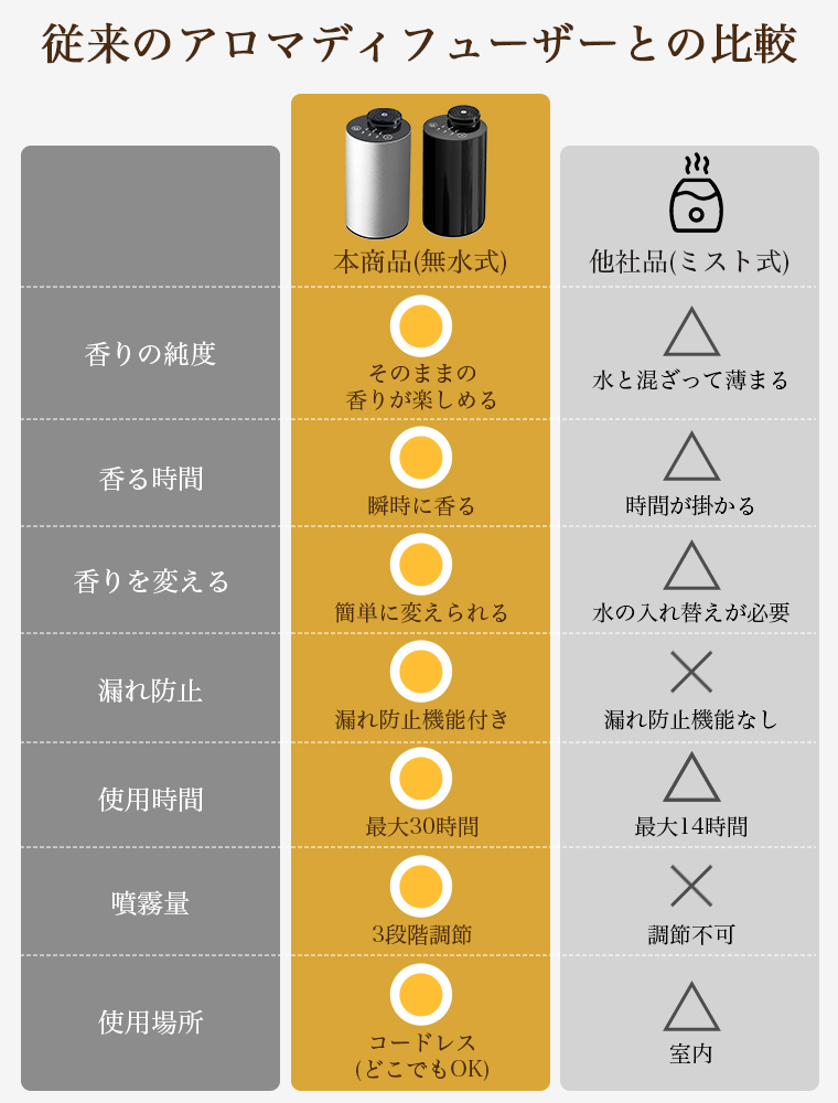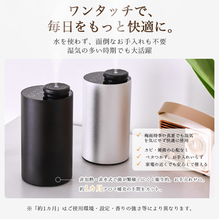 従来の超音波式と違い、水を混ぜず天然オイル100%*を直接ミスト化。香りが瞬時に広がり、水がないからカビや雑菌の繁殖リスクを大幅にカット。