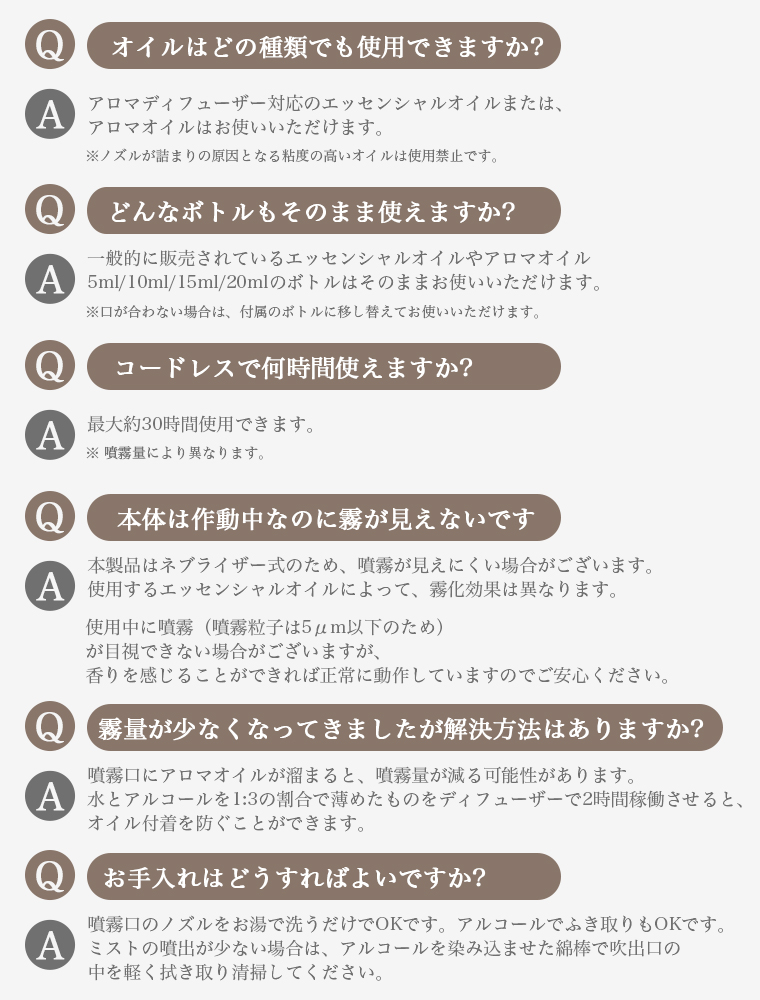 大容量2000mAhバッテリー内蔵。フル充電なら最長約50時間コードレス使用可能。置き場所を選ばず、香りをいつも身近に。