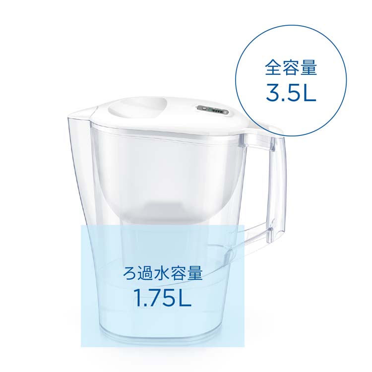 ●ろ過水容量について:2020年10月1日の家庭用品品質表示法に係る雑貨工業品品質表示規程の一部改正にもとづき、定められた方法で測定した容量です。原水貯留部(ろ過される前の水道水が貯まる部分)の最下部まで貯留する水量を表示しています。