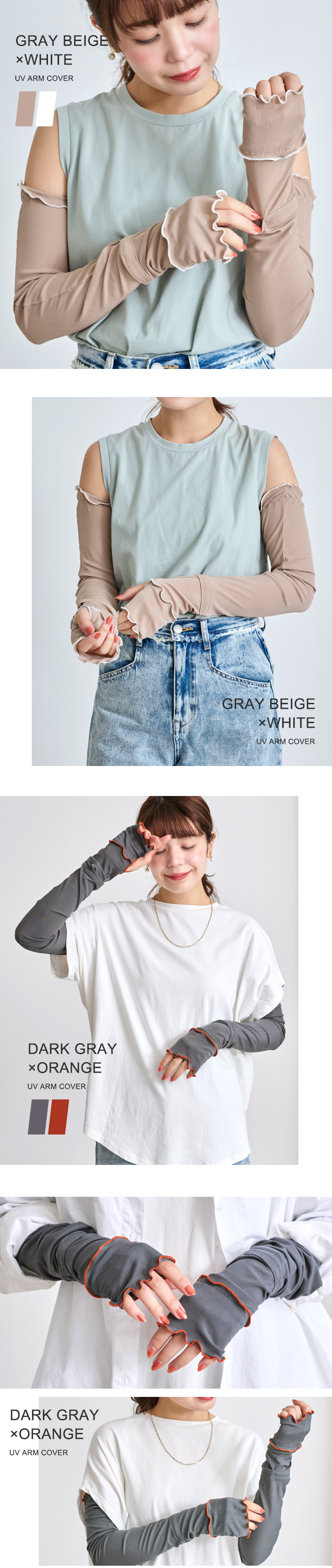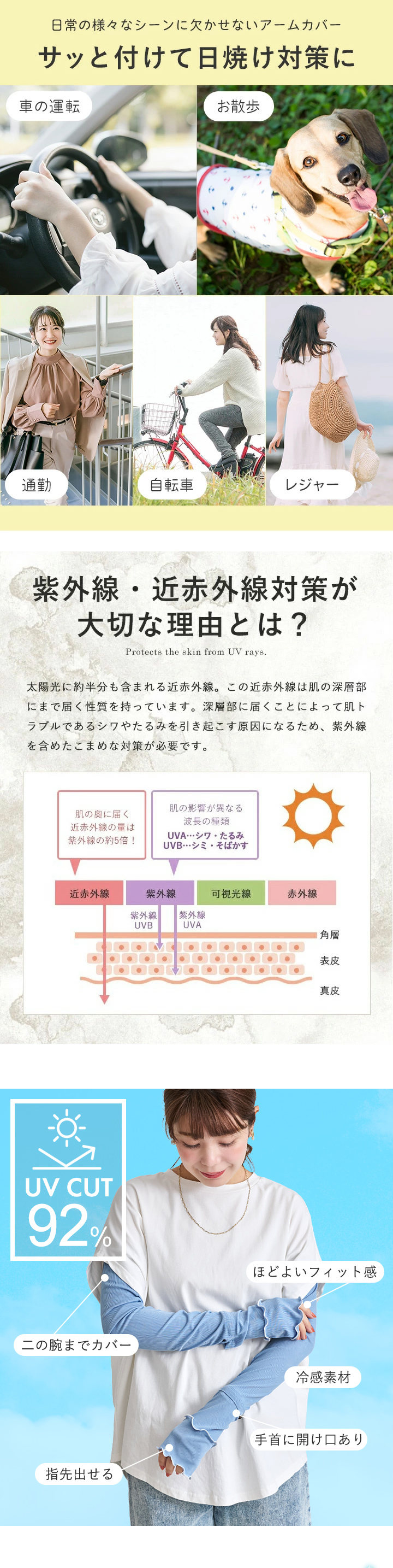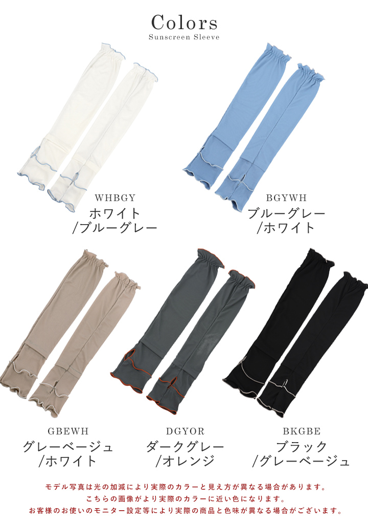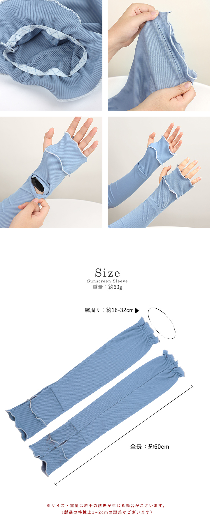 ・UV対策商品ですが、紫外線をシャットアウトすることはできません。特に淡色部分は紫外線を通し易くなっております。日差しが強い時や真夏の炎天下に長時間いる場合は日焼け止めクリームとの併用をお勧めします。