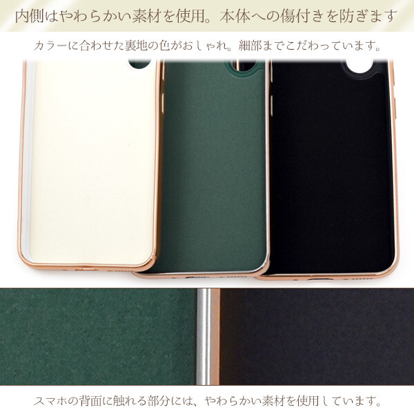 ケース内側には柔らかい素材を使用し、スマホ本体への傷付きを防ぎます。