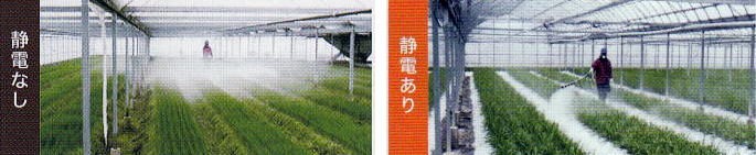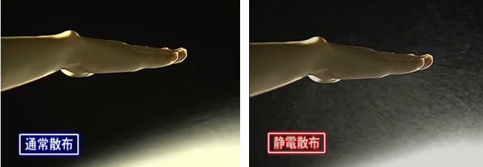 ●噴霧粒子に静電を付加することによって、粒子の方から作物に吸い寄せられ、漂う粒子(霧)が少なくなります。(ドリフト低減)