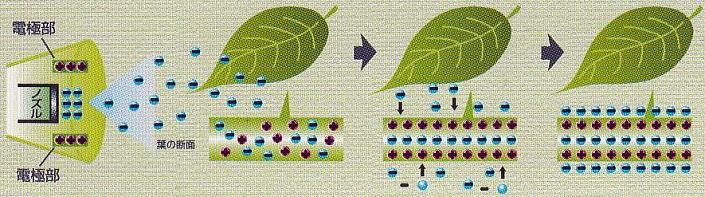 ●ノズルの外周電極部にプラスの高電圧をかけます。 ●ノズルから噴霧された粒子が電極部を通過する時マイナスに帯電され噴霧します。 ●マイナスに帯電された噴霧粒子が葉に付くと、葉の表と裏はプラスに分極されます。 ●マイナスに帯電された噴霧粒子は葉の表裏のプラス面に付着します。