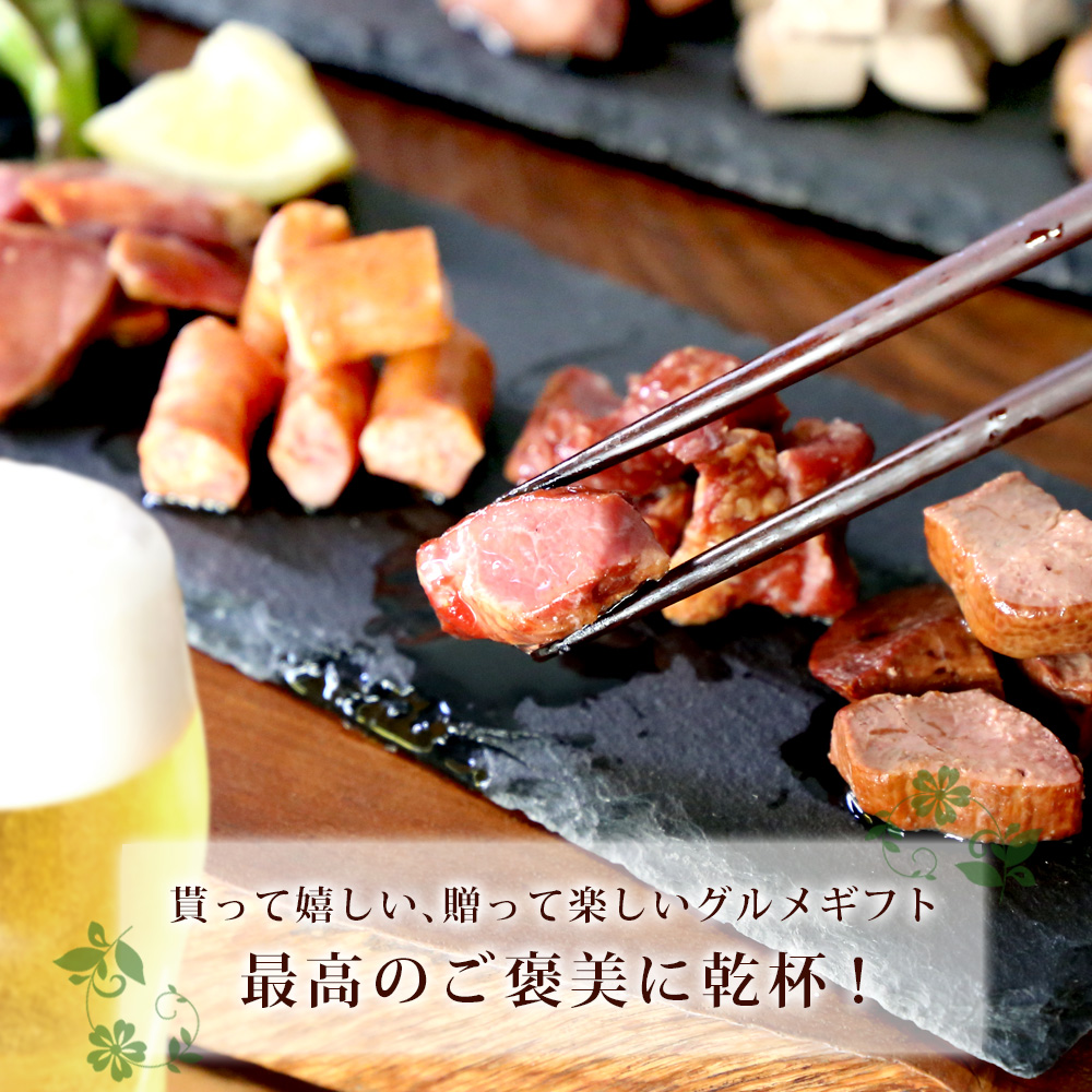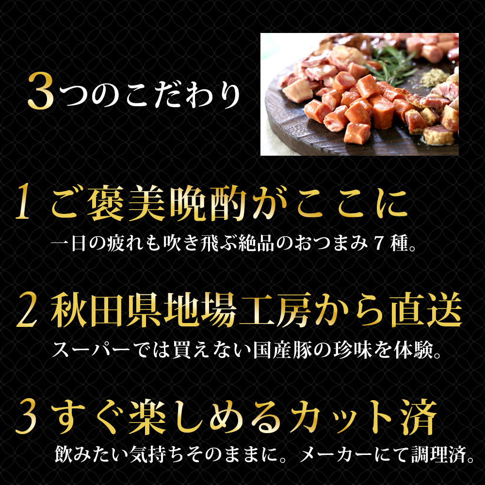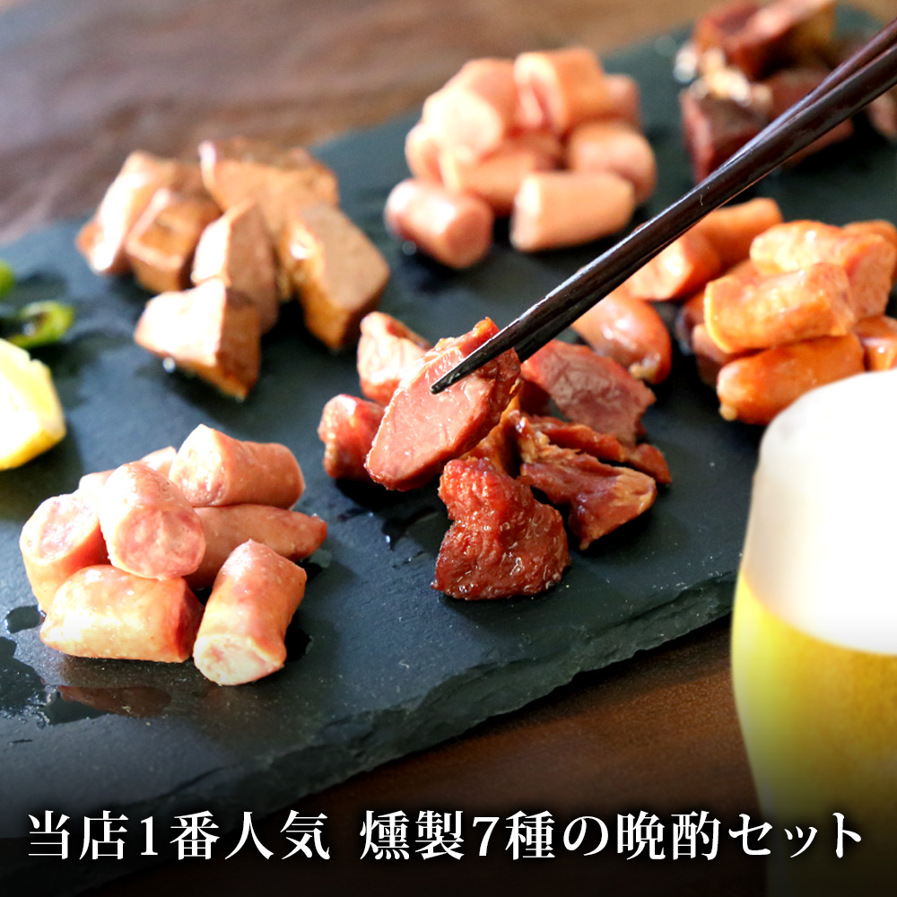 1.お手軽におうちで食べられる本格こだわりおつまみ!王道のウィンナーや他ではお目にかかれない豚ハラミの燻製など豪華7種類を詰め合わせにしました。