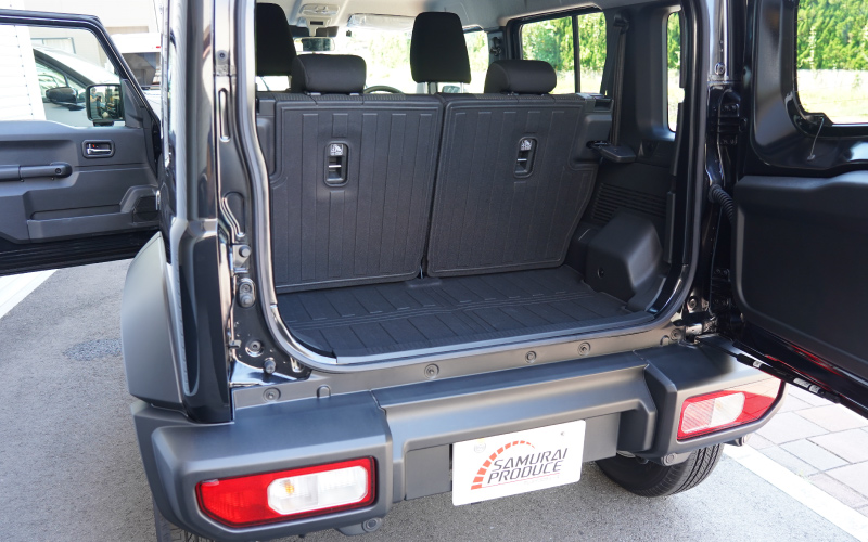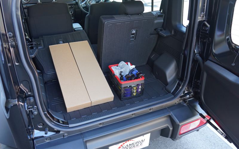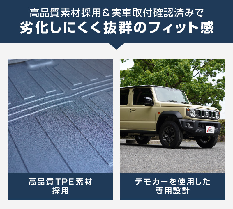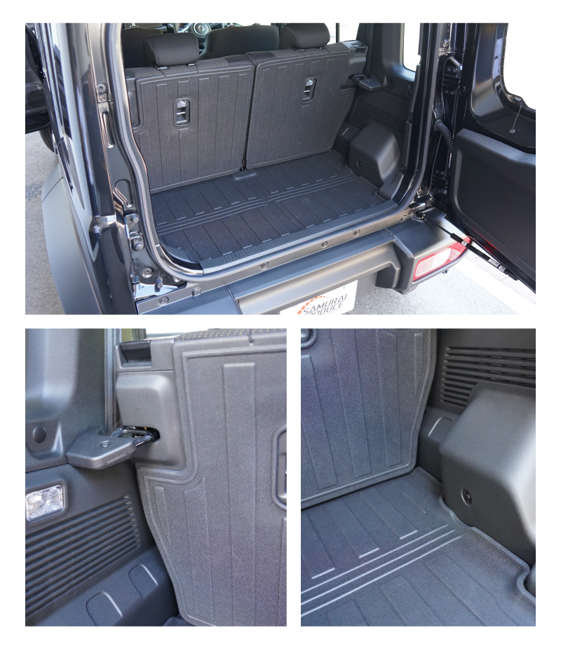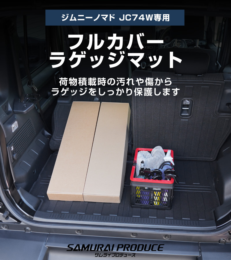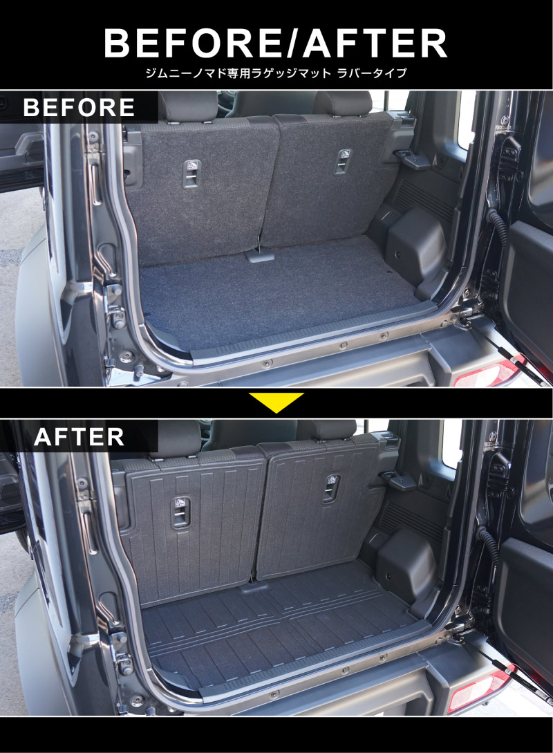 ジムニーノマド専用のセカンドシート背面とラゲッジスペースに取り付けるラバータイプのマットです。