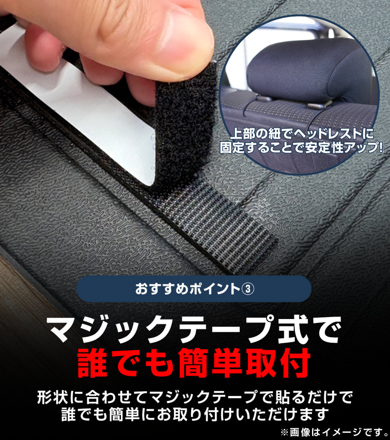 ヘッドレストに紐で固定し、マジックテープでしっかり留められる設計で、使用中にズレる心配もありません。