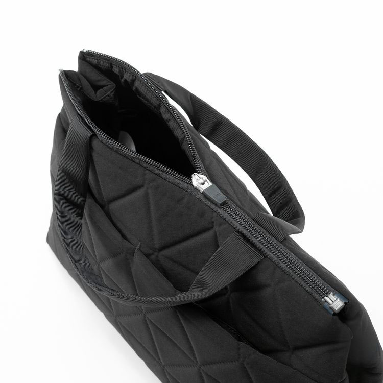 電子機器やその周辺アクセサリーの収納に便利な自立型のトートバッグです。クッション性を持たせたオープンジッパーのメインコンパートメントは、13インチまでのノート型PCやA4サイズの書類の収納が可能。社内や出張先、学校内での使用におすすめです