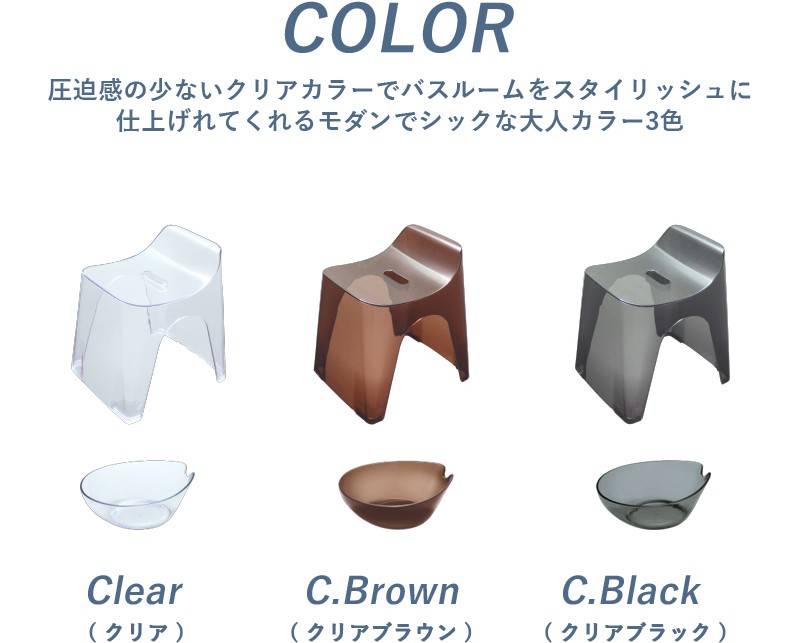 また、クリアカラーは狭いバスルームに置いておいても見た目の圧迫感が少なく、広々とした明るい印象にしてくれます。