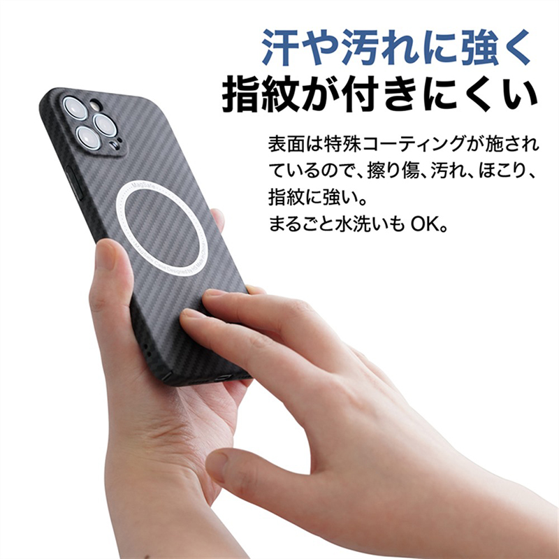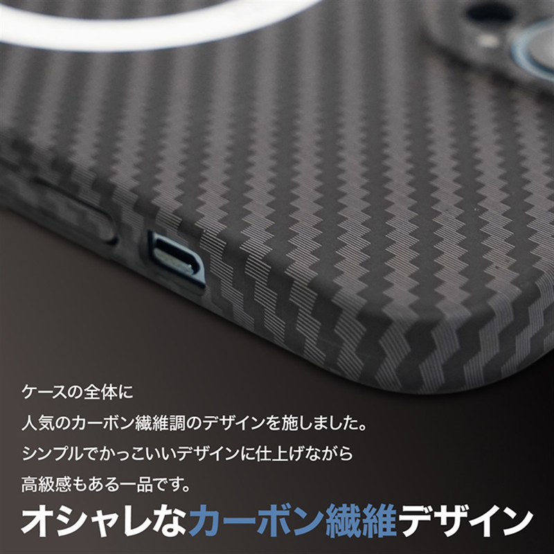 ケース全体に人気のカーボン繊維調のデザインを施したことで