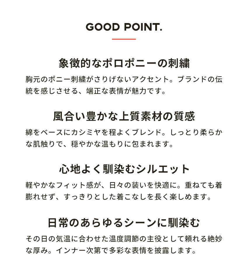 胸にラルフローレンの象徴であるポニーが刺繍されたニット。1枚でももちろん、ジャケットのインナーとしてもお使いいただけます。シンプルな定番デザインなのでコーディネートに困らないアイテムです。