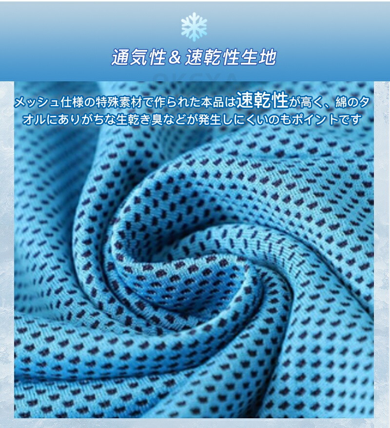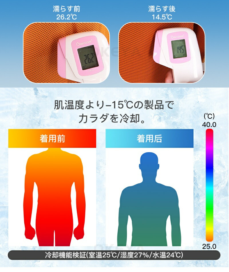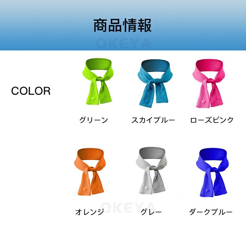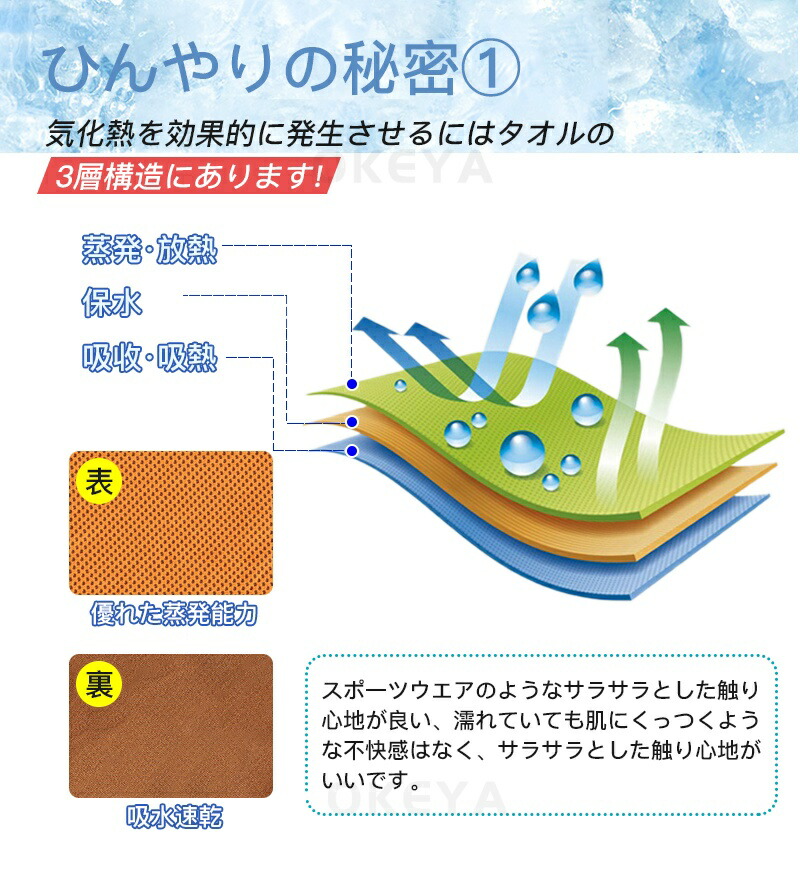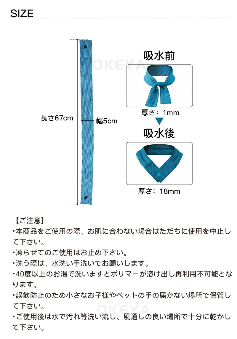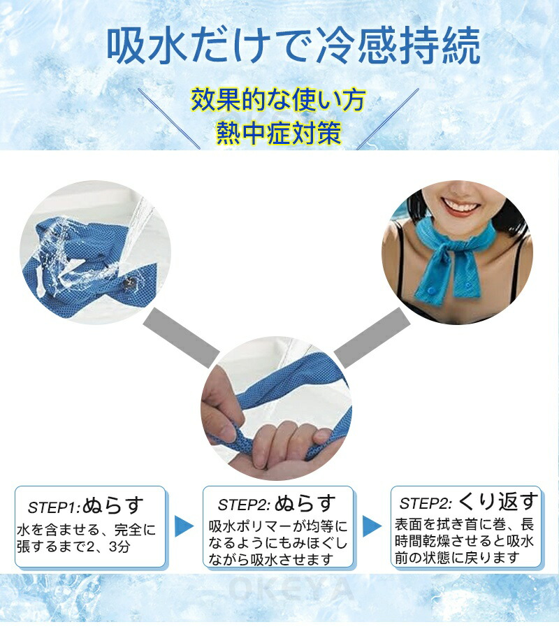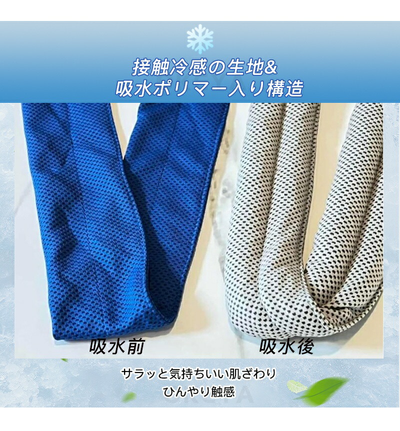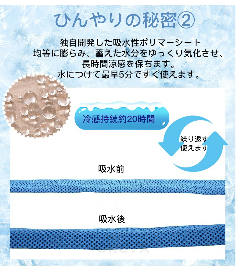 吸水ポリマー入りの冷感ネックタオル 気化熱冷却のある冷感素材タオルの中に、吸水ポリマーを入れてひんやりを長時間持続できるようになりました。 水につけて少し絞って振るだけで、何度も繰り返しお使い頂けるため経済的でエコなアイテムです。