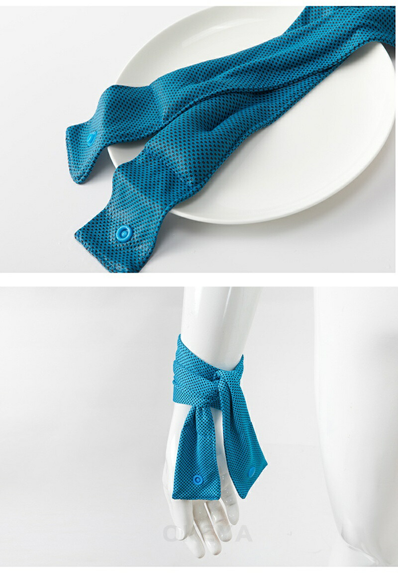・軽く絞って振って冷やし、首に巻きます。ボタンでリング状に止める事が出来ます。