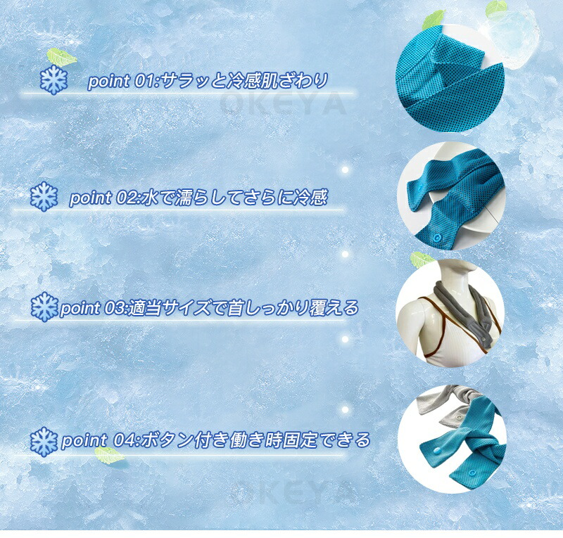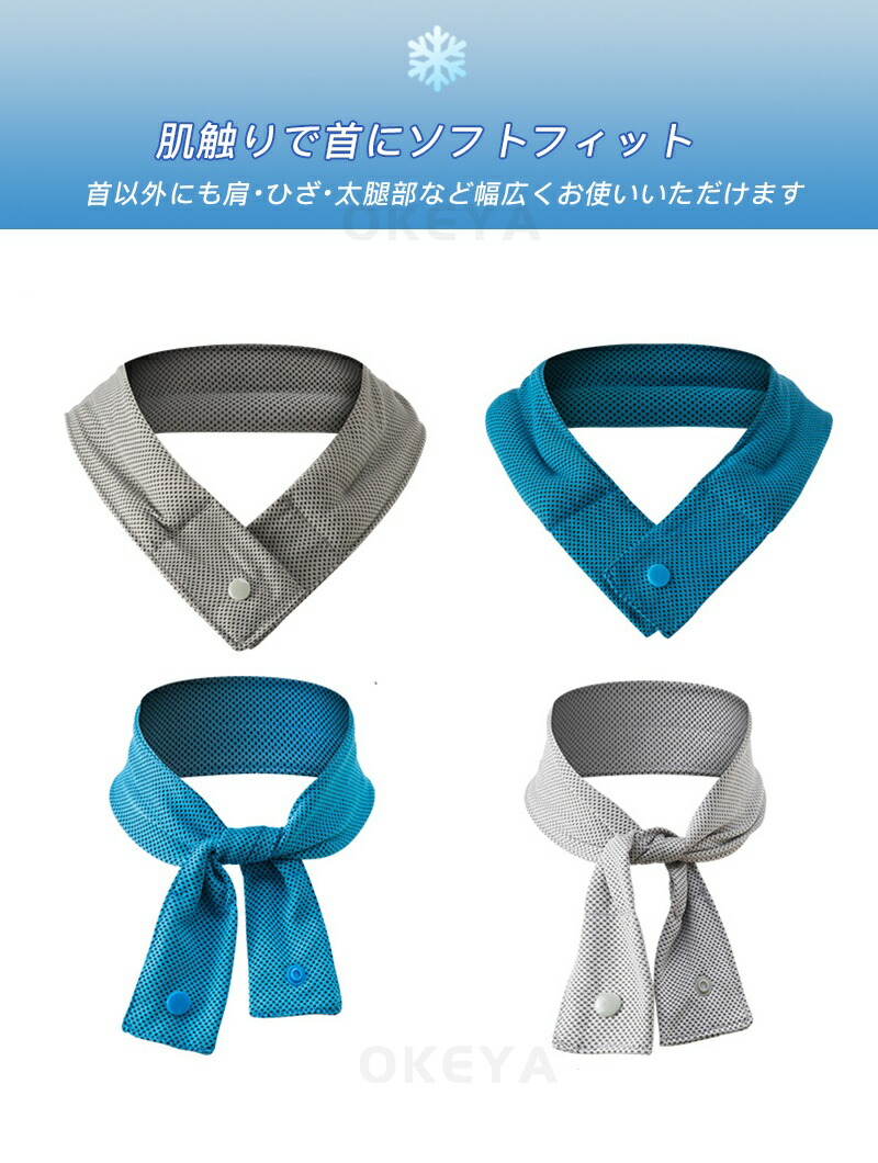 【肌触りで首にソフトフィット】水が蒸発する際に熱を奪う気化熱を利用した自然の冷たさで、濡らしたタオルを巻いたような涼感を長時間得ることができます。首以外にも肩・ひざ・太腿部など幅広くお使いいただけます