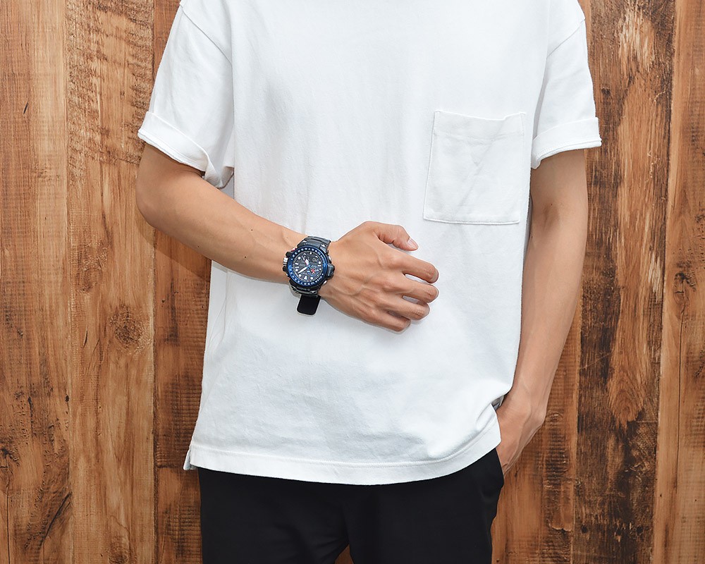 カシオの「GWN-1000B-1BJF」 樹脂素材とステンレス素材の丸型ケースと樹脂素材のベルト。文字盤にはアナデジを採用しています。機能として、フルオートカレンダー、ワールドタイム等を搭載。また、中留め構造は穴留め式です。 GWN1000B1BJF