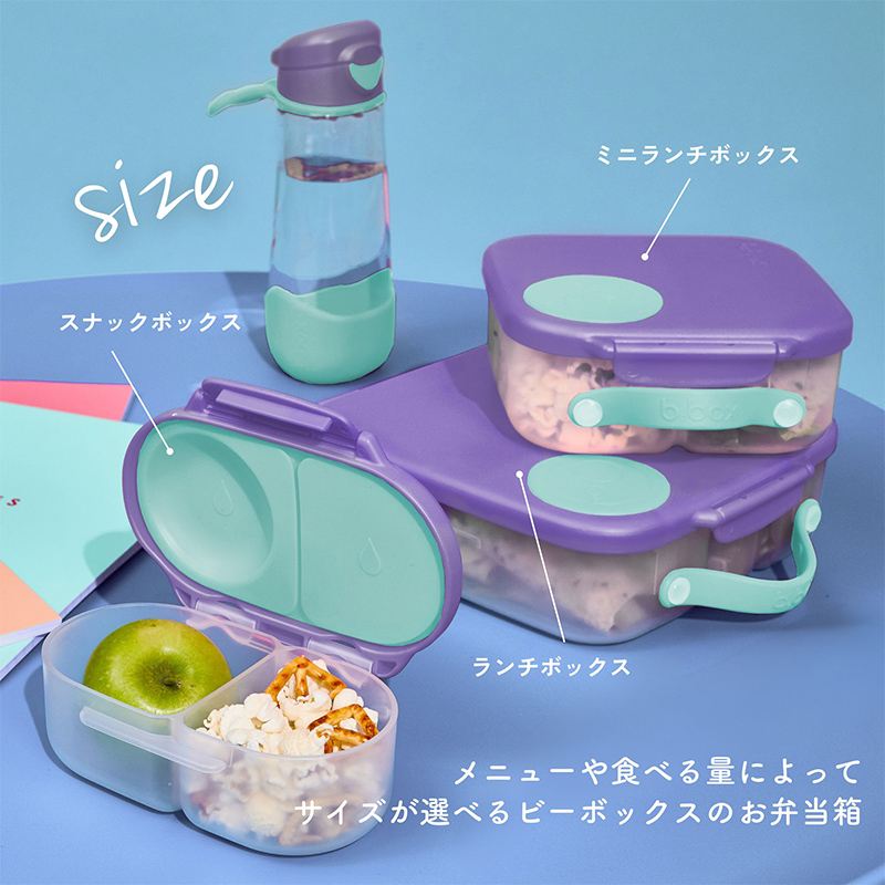 b.box(ビーボックス)ランチボックスは、2Lの大容量でおにぎり・サンドイッチ・サラダ・フルーツまでまとめて持ち運べるお弁当箱。漏れを防止しやすい収納パート、フルーツを丸ごと入れやすい伸縮フォルダー、量に合わせて調整・取り外しできる仕切り付き。