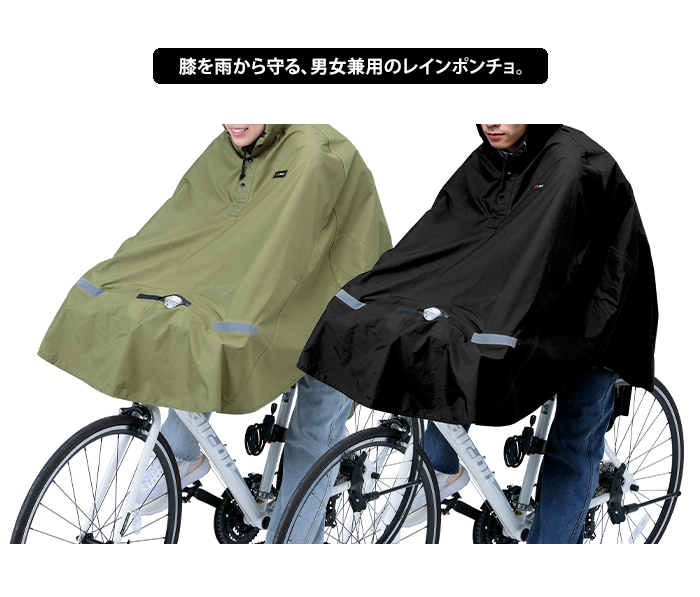 送料込み 膝を雨から守る、男女兼用のレインポンチョ。 クロスバイク対応 リュック・ライト対応