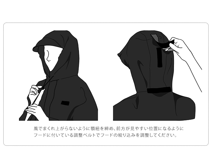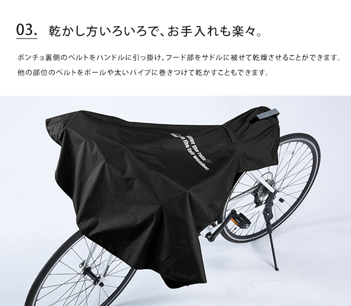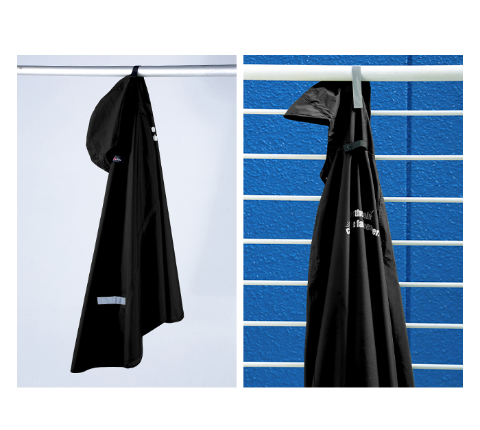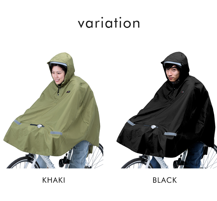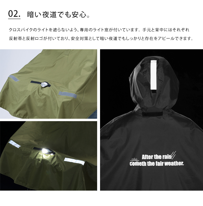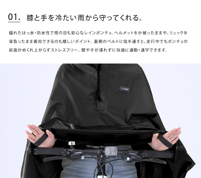 優れたはっ水・防水性で雨の日も安心なレインポンチョ。ヘルメットをか被ったままや、リュックを背負ったまま着用できるのも嬉しいポイント。裏側のベルトに指を通すと、走行中でもポンチョの前面がめくれ上がらずストレスフリー。膝や手が濡れずに快適に通勤・通学できます。クロスバイクのライトを遮らないよう、専用のライト窓付き。手元と背中にはそれぞれ反射帯と反射ロゴが付いており、安全対策として暗い夜道でもしっかりと存在をアピールできます。
