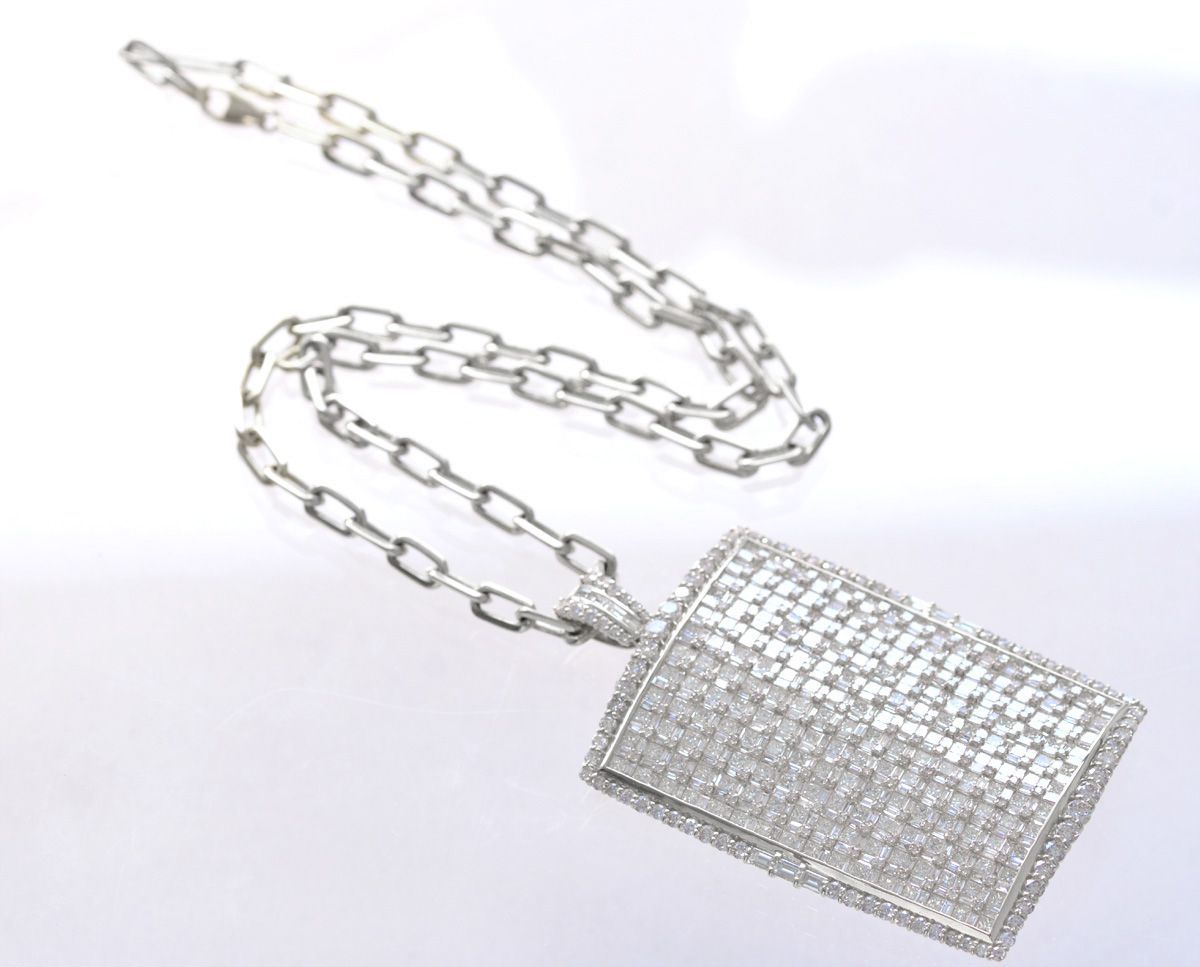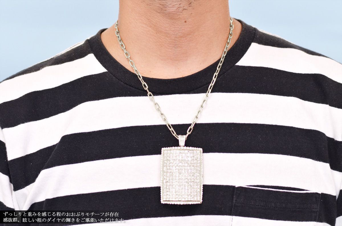 視聴ページへ(外部サイト)プラチナを使ったメンズネックレスです。トータル約20カラットものダイヤモンドを贅沢に使いぎっしりと埋め尽くした縦約71mmもの大振りのモチーフ。バチカン部分まで埋め尽くされたダイヤモンドは無色透明で良質なルースを厳選。バゲットカットとプリンセスカット、そしてランドブリリアントカット3種類の形状それぞれの持つ特性が合わさって光の相乗効果。太陽光はもちろん、蛍光灯の下ですらもギラギラと強く輝き、大げさでは無く眩しい程の煌めきで周囲の目を釘付けにする程。ビーチシーンでも注目を浴びる事間違い無し。唯一無二の迫力溢れる男の胸元に。人気のアズキチェーンをお付けしてお送り致します。チェーンは長さ指定作成可能。充分に存在感を放つコマの形状でチェーン単体、その他大き目のペンダントトップに通して幾通りもお楽しみいただけます。留め金に近い部分のプレートにお好きなイニシャル、数字等で刻印可能。記念日のプレゼントにもお勧めです。