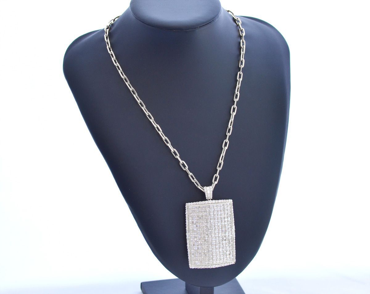 プラチナを使ったメンズネックレスです。トータル約20カラットものダイヤモンドを贅沢に使いぎっしりと埋め尽くした縦約71mmもの大振りのモチーフ。バチカン部分まで埋め尽くされたダイヤモンドは無色透明で良質なルースを厳選。バゲットカットとプリンセスカット、そしてランドブリリアントカット3種類の形状それぞれの持つ特性が合わさって光の相乗効果。太陽光はもちろん、蛍光灯の下ですらもギラギラと強く輝き、大げさでは無く眩しい程の煌めきで周囲の目を釘付けにする程。ビーチシーンでも注目を浴びる事間違い無し。唯一無二の迫力溢れる男の胸元に。