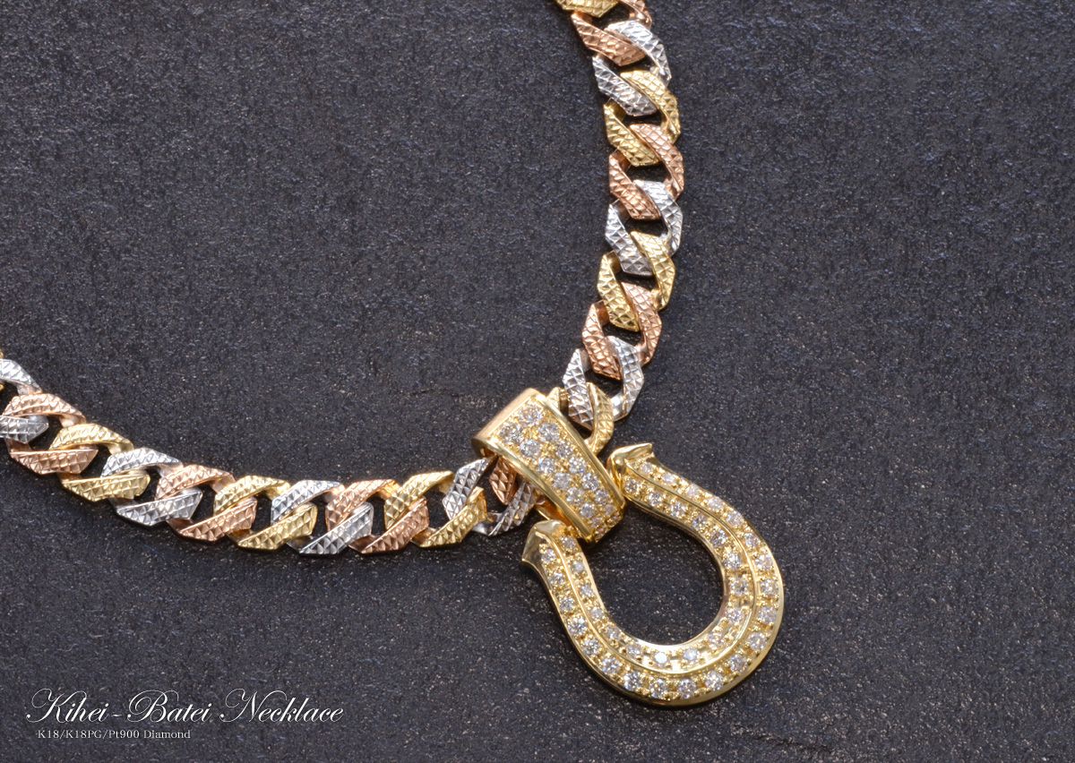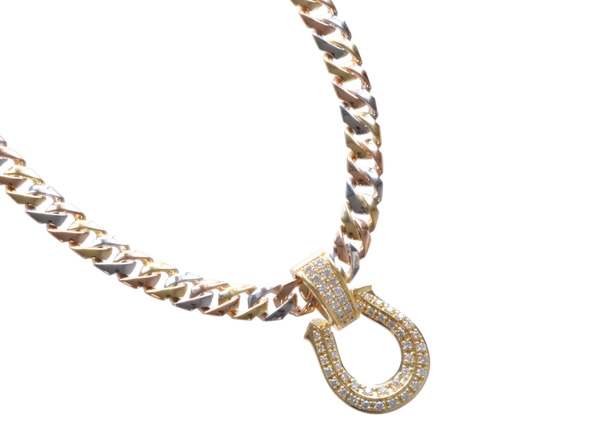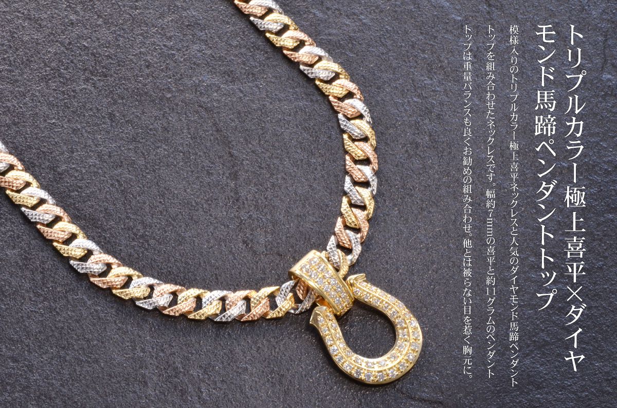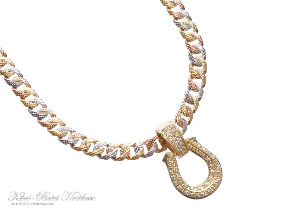 トリプルカラー極上喜平ネックレスとK18馬蹄ダイヤモンドペンダントトップを組み合わせた一押しネックレスです。ずっしりと重みを感じる約7mmのコマは重厚感溢れる仕上がり。蛇柄のような模様のややマットな質感と無地面の艶やかな地金の輝きを1本で楽しめるお得なデザイン。3色のコマを交互に繋いだトリプルカラー仕様の喜平ネックレスは独特の存在感を放つ胸元に。しっかりと重みのあるコマの形状で装着した際の収まりも良く肌に吸い付くしっとりと滑らかな着け心地。重すぎず普段使いにお勧めの重量感。喜平ネックレスと重量バランスも良くお互いの良さを活かした組み合わせです。