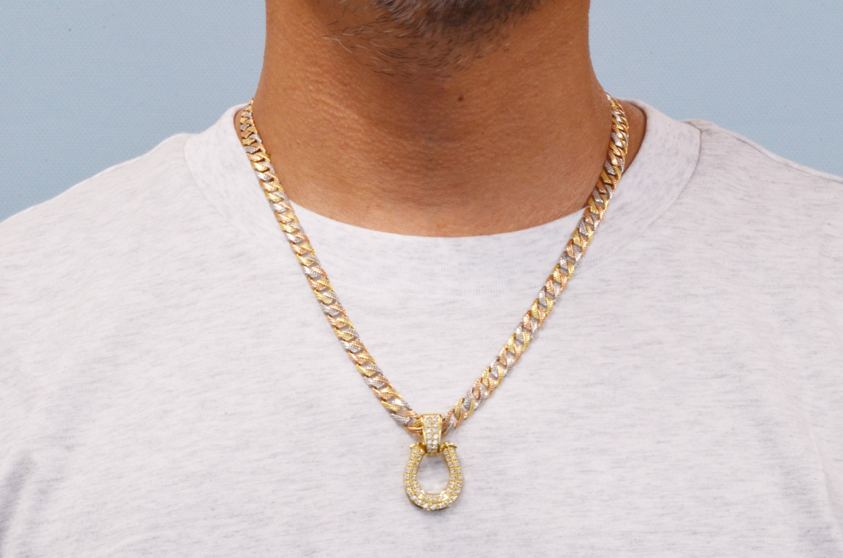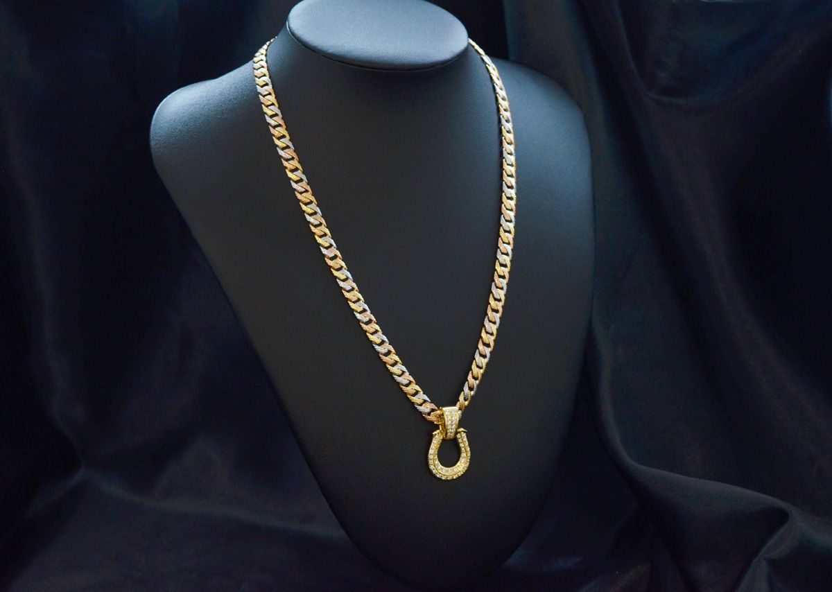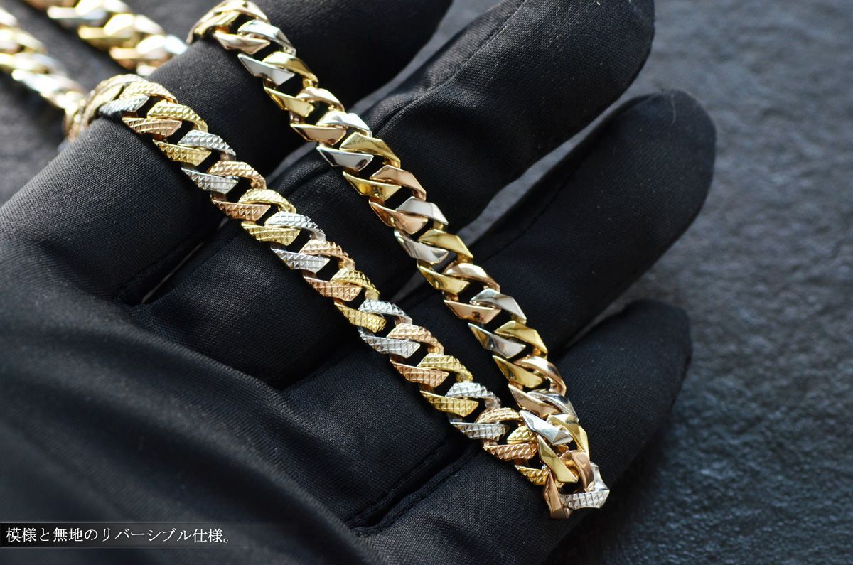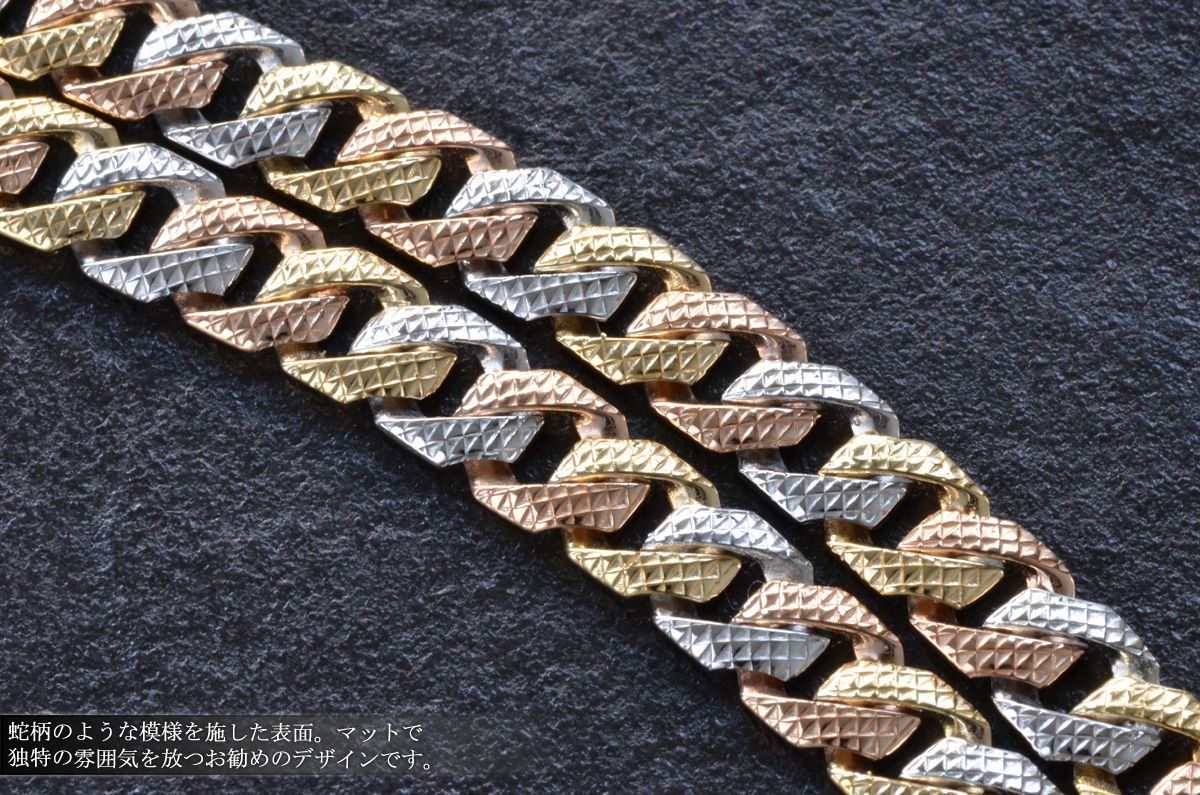 トリプルカラー極上喜平ネックレスとK18馬蹄ダイヤモンドペンダントトップを組み合わせた一押しネックレスです。ずっしりと重みを感じる約7mmのコマは重厚感溢れる仕上がり。蛇柄のような模様のややマットな質感と無地面の艶やかな地金の輝きを1本で楽しめるお得なデザイン。3色のコマを交互に繋いだトリプルカラー仕様の喜平ネックレスは独特の存在感を放つ胸元に。しっかりと重みのあるコマの形状で装着した際の収まりも良く肌に吸い付くしっとりと滑らかな着け心地。重すぎず普段使いにお勧めの重量感。喜平ネックレスと重量バランスも良くお互いの良さを活かした組み合わせです。