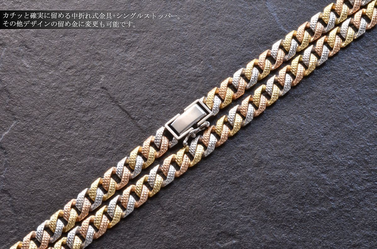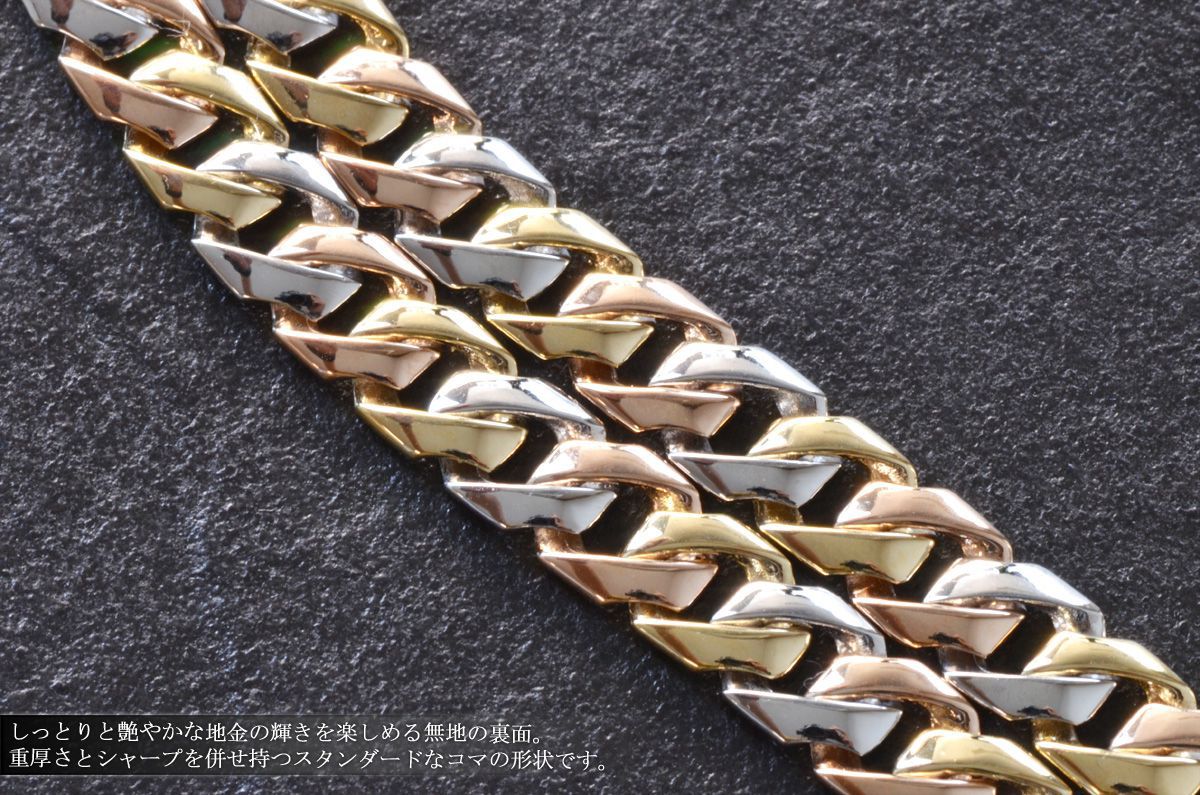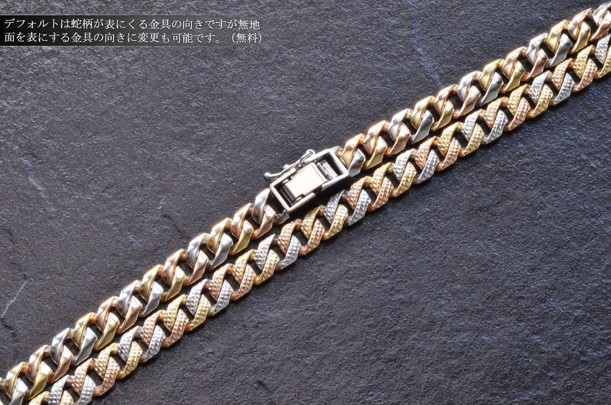 トリプルカラー極上喜平ネックレスとK18馬蹄ダイヤモンドペンダントトップを組み合わせた一押しネックレスです。ずっしりと重みを感じる約7mmのコマは重厚感溢れる仕上がり。蛇柄のような模様のややマットな質感と無地面の艶やかな地金の輝きを1本で楽しめるお得なデザイン。3色のコマを交互に繋いだトリプルカラー仕様の喜平ネックレスは独特の存在感を放つ胸元に。しっかりと重みのあるコマの形状で装着した際の収まりも良く肌に吸い付くしっとりと滑らかな着け心地。重すぎず普段使いにお勧めの重量感です。遠目からでも目を惹きます。カチっと確実に留める中折れ式金具×シングルストッパーをデフォルトでお付け致します(その他変更も可能)馬蹄トップはダイヤモンドを約1カラットも使った人気のデザイン。喜平ネックレスと重量バランスも良くお互いの良さを活かした組み合わせです。メンズネックレス ペンダント 18金 プラチナ 男性用 日本製 職人が造る本格ジュエリー アクセサリーマート 20代 30代 40代 50代 60代 70代 大人 贈り物 プレゼント 彼氏 旦那 ギフト KIHEI 喜平