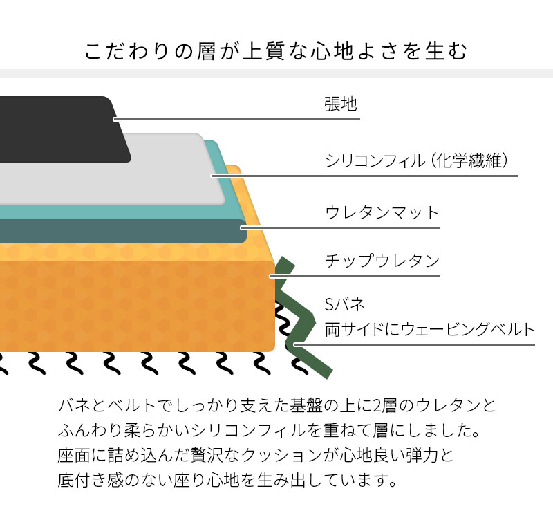 クッション材:Sバネ、ウェービングベルト、ウレタン、ポリエステル綿、不織布