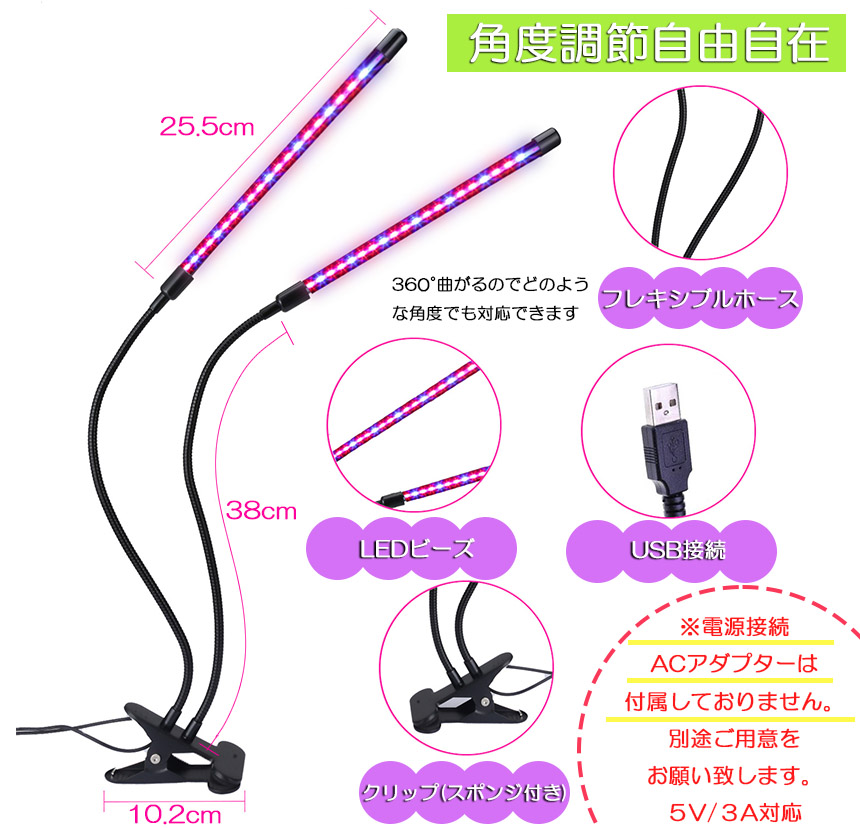 【 USB充電口・安定性UP・省エネ】充電口の設計、オフィスや家庭用により多く便利です。ランプヘッド回路を強化・改良し、明るさをより安定させています。植物育成ライト定格消費電力(40W),LED使用で電気代節約、経済的LEDなので、発熱量が少ないし、省エネルギー低コストで植物を育てます。また、従来蛍光灯の約4〜8倍も寿命が長くなります。