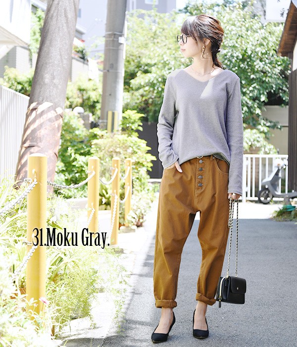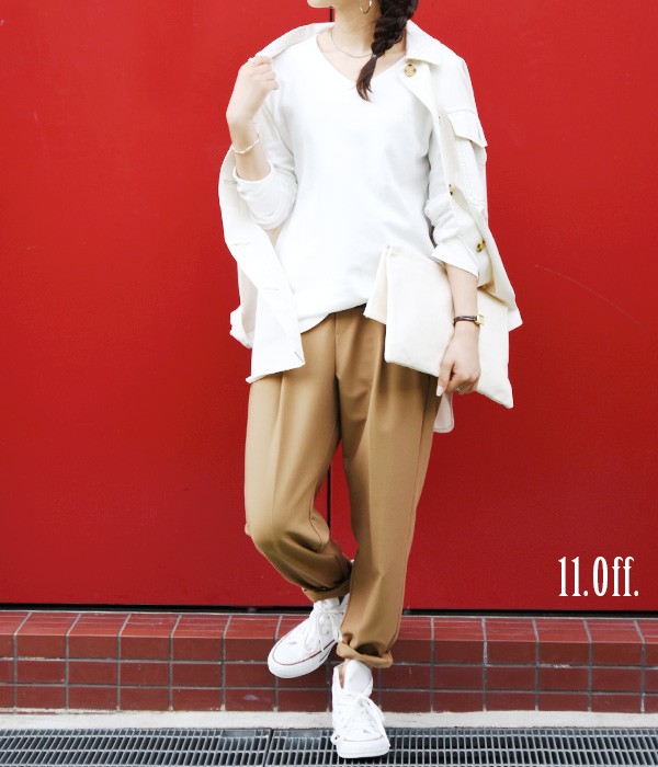 [M]サイズを着用。ゆるっとなりすぎずスッキリとしたシルエットでした☆着丈は後ろの長い方がお尻が隠れて2、3cm程下の丈感で、袖丈は指が少し隠れました。Vネックの綺麗なデコルテラインが大人っぽい印象に。厚みのある生地感が安心感がありますね。