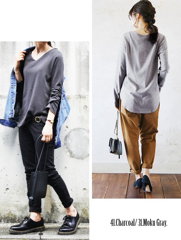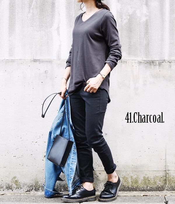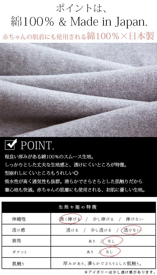 [LL]サイズを着用。伸縮性のあるコットン100%生地なので窮屈感がなく、ストレスフリーでした。日本製なので安心感があり、肌触りも優しいです◎ネックに抜け感があったり、すっきりと見えるシルエットなので着回しのきくアイテムですね!