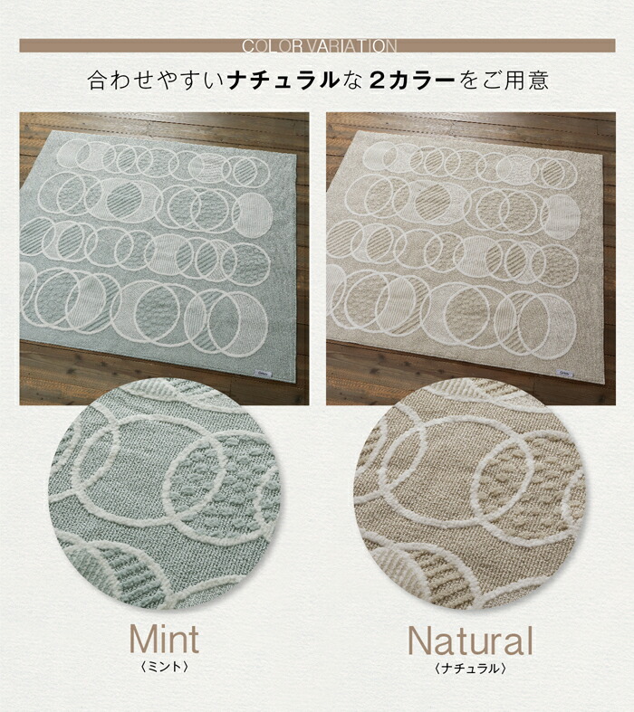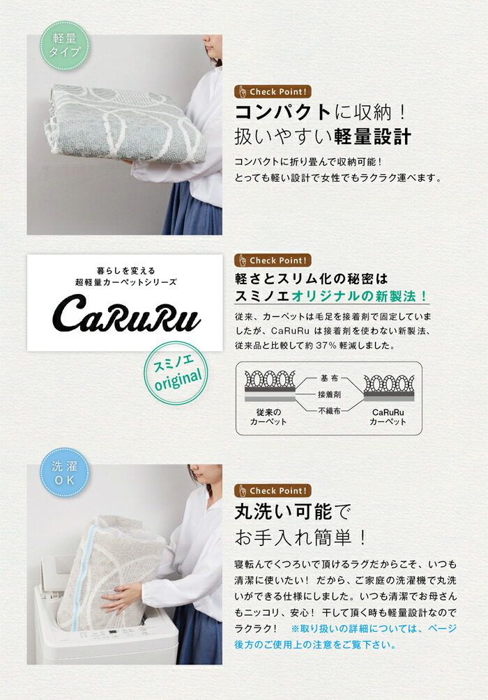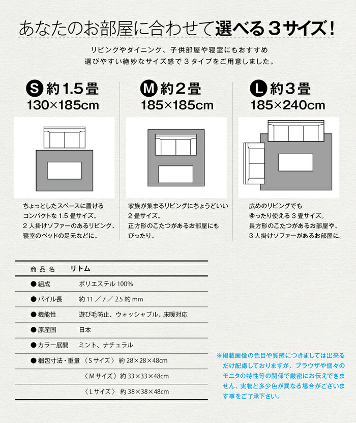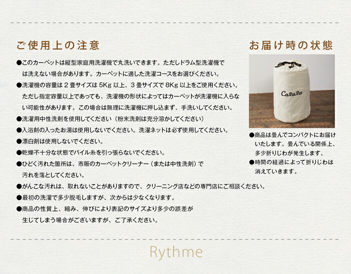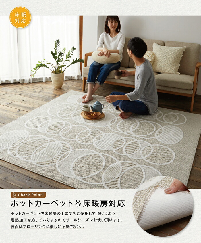 洗える、洗濯機OK(洗濯ネット使用)、遊び毛出にくい、ホットカーペット対応、床暖房対応
