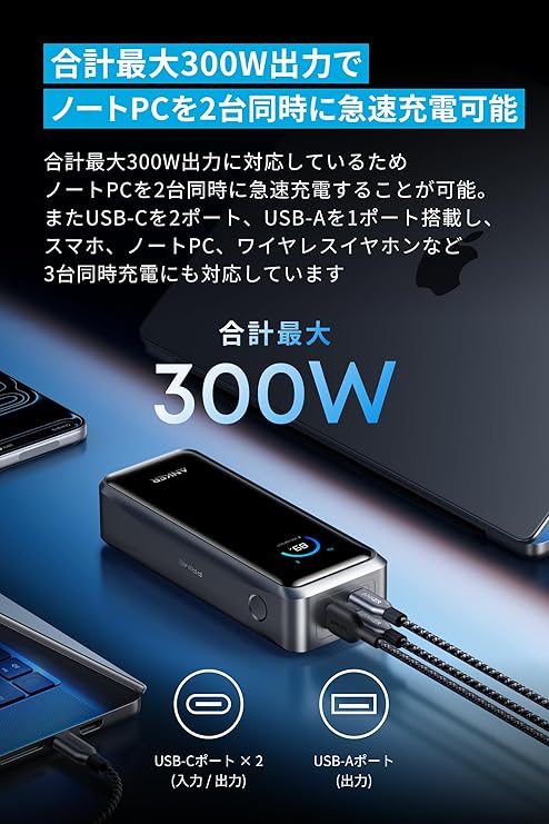 合計最大300W出力に対応しているためノートPCを2台同時に急速充電することが可能。またUSB-Cを2ポート、USB-Aを1ポート搭載し、スマホ、ノートPC、ワイヤレスイヤホンなど3台同時充電にも対応しています。