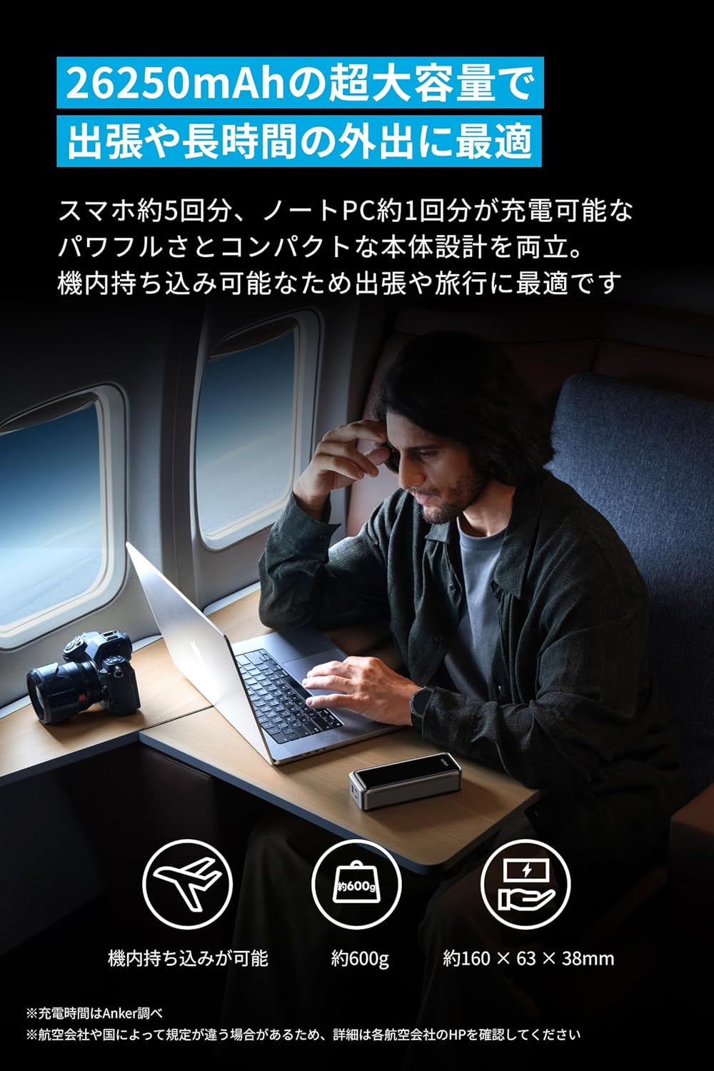 スマホ約5回分、ノートPC約1回分が充電可能なパワフルさとコンパクトな本体設計を両立。機内持ち込み可能なため出張や旅行に最適です。