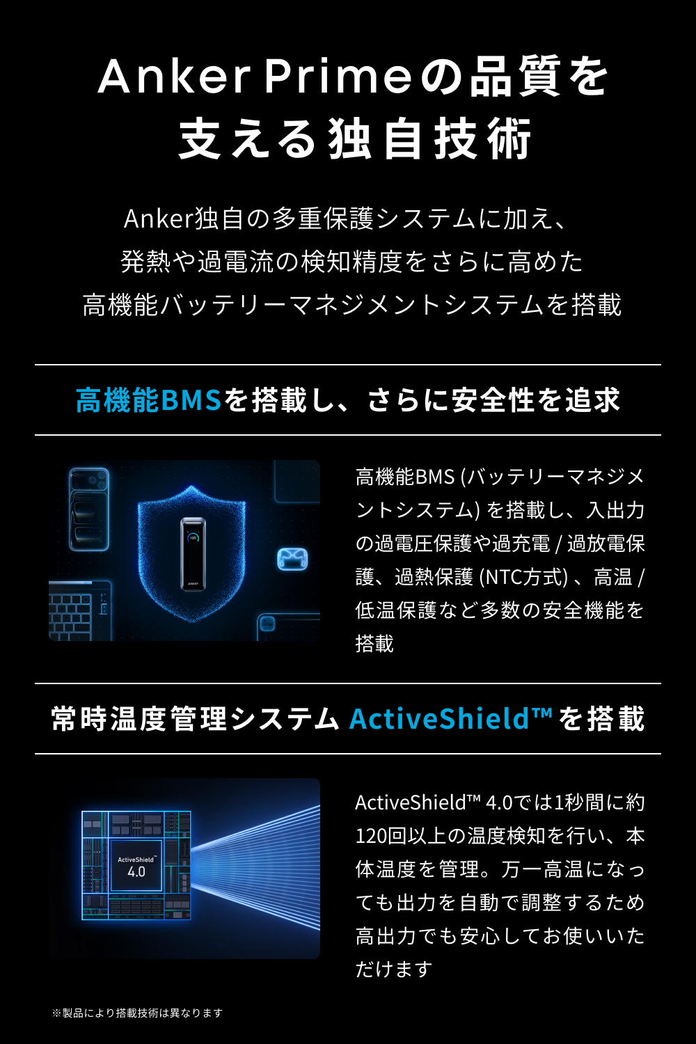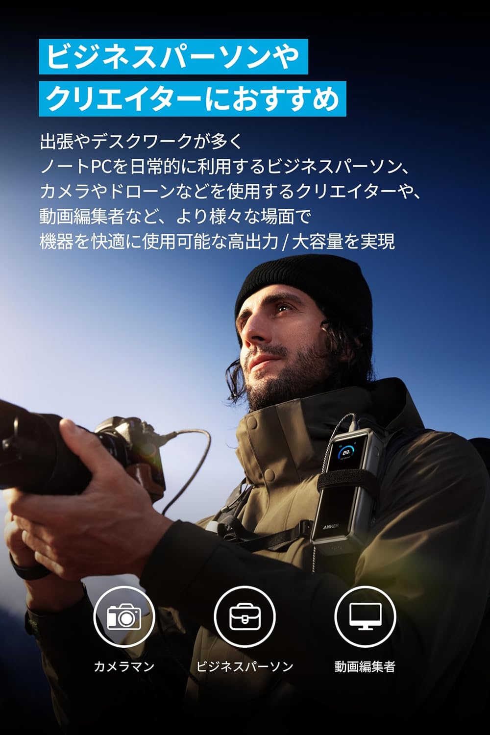 出張やデスクワークが多くノートPCを日常的に利用するビジネスパーソン、カメラやドローンなどを使用するクリエイターや、動画編集者など、より様々な場面で機器を快適に使用可能な高出力/大容量を実現。