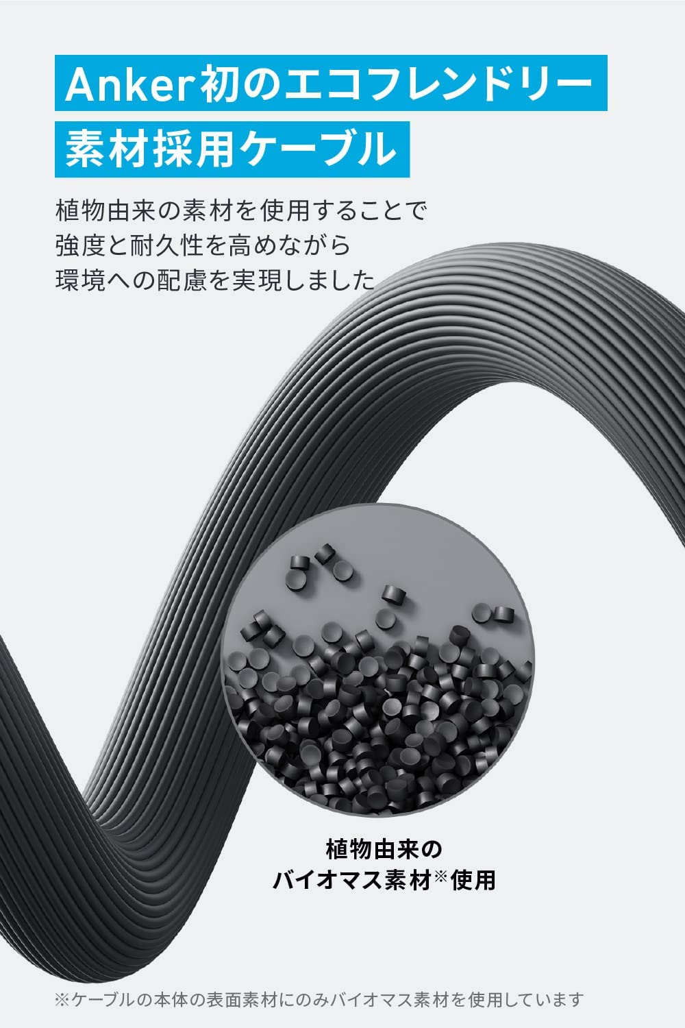・Anker初のエコフレンドリー素材採用:Ankerの従来のケーブル製品の外装はプラスチック素材を100%使用していたところ、本製品は60%に削減し、40%はトウモロコシやサトウキビなどの植物由来のエコフレンドリー素材に置き換えました。さらに製品本体だけでなくパッケージにも配慮し、本製品に合わせて主に紙を使用することで、プラスチック使用量の削減に取り組んでいます。