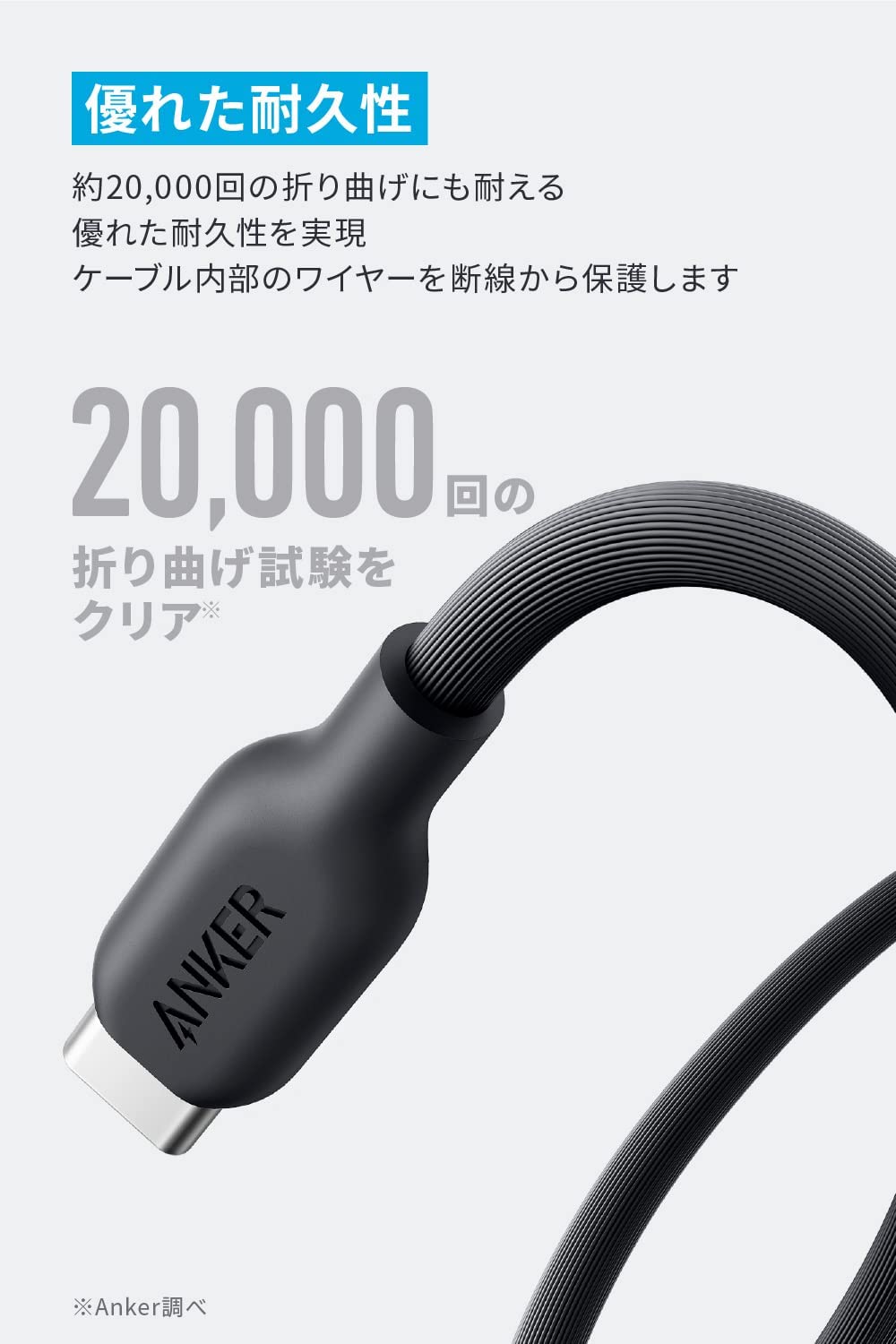 20,000回以上の折り曲げにも耐える優れた耐久性を実現しているため、ケーブル内部のワイヤーを断線から保護し、安心して充電することができます。