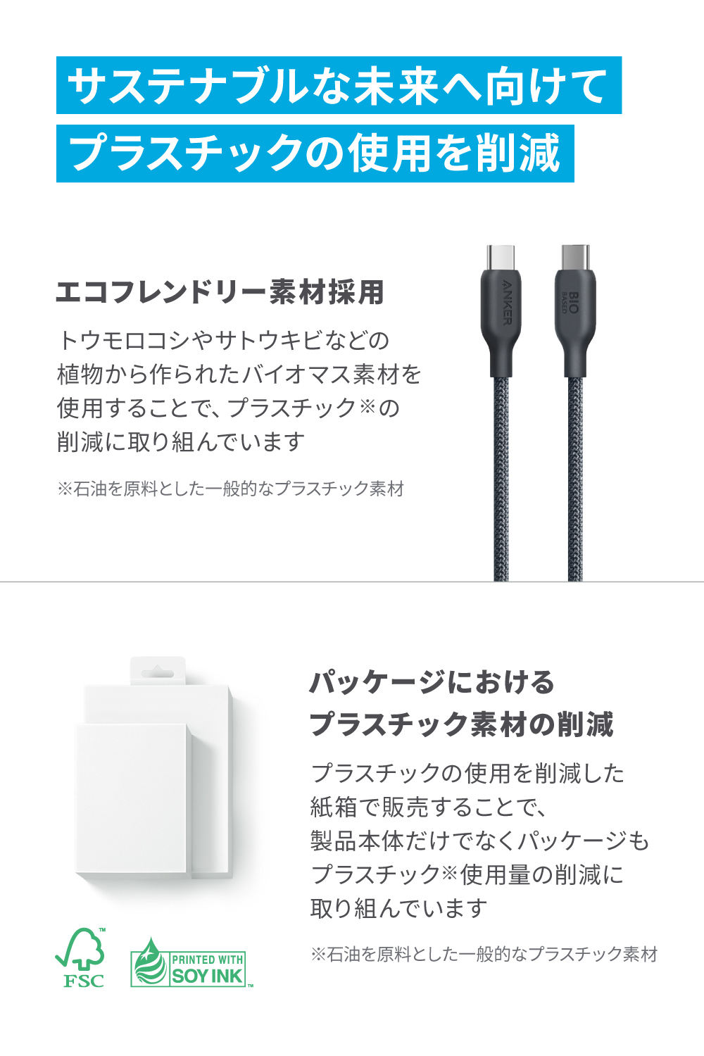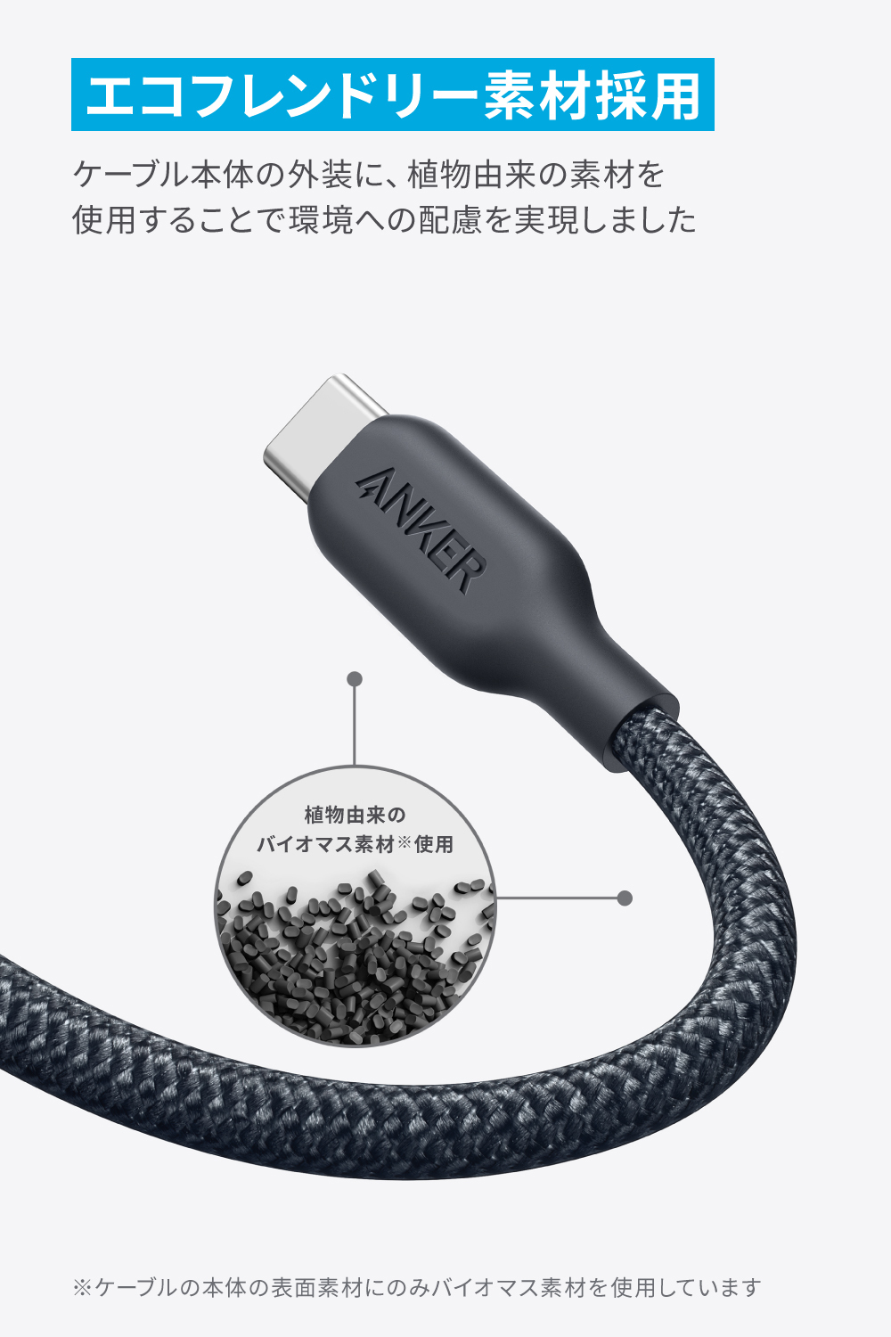 エコフレンドリー素材採用:ケーブル本体の外装に、植物由来の素材を使用することで環境への配慮を実現しました。※ケーブルの本体の表面素材にのみバイオマス素材を使用しています。