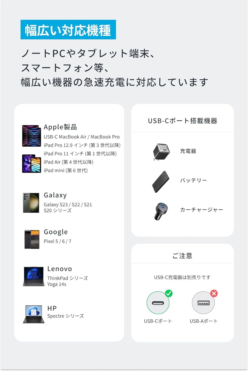 ・幅広い対応機種:ノートPCやタブレット端末、スマートフォン等幅広い機器に急速充電対応しています。