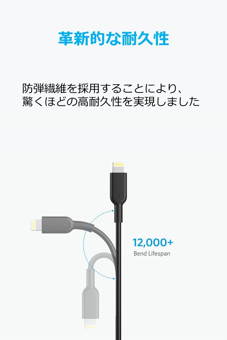 ・究極の耐久性:一般的なケーブルより12倍以上の耐久性をもち、12000回以上の厳しい折り曲げテストもクリアしました。