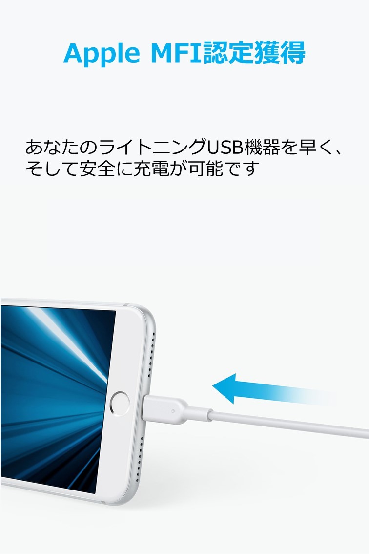 PowerLine II はApple社に許可を受けた証であるMFi認証を取得しており、安心してご使用頂けます。 iPhoneやiPad、iPod、その他のライトニング端子機器に対して最適に動作するよう設計されています。