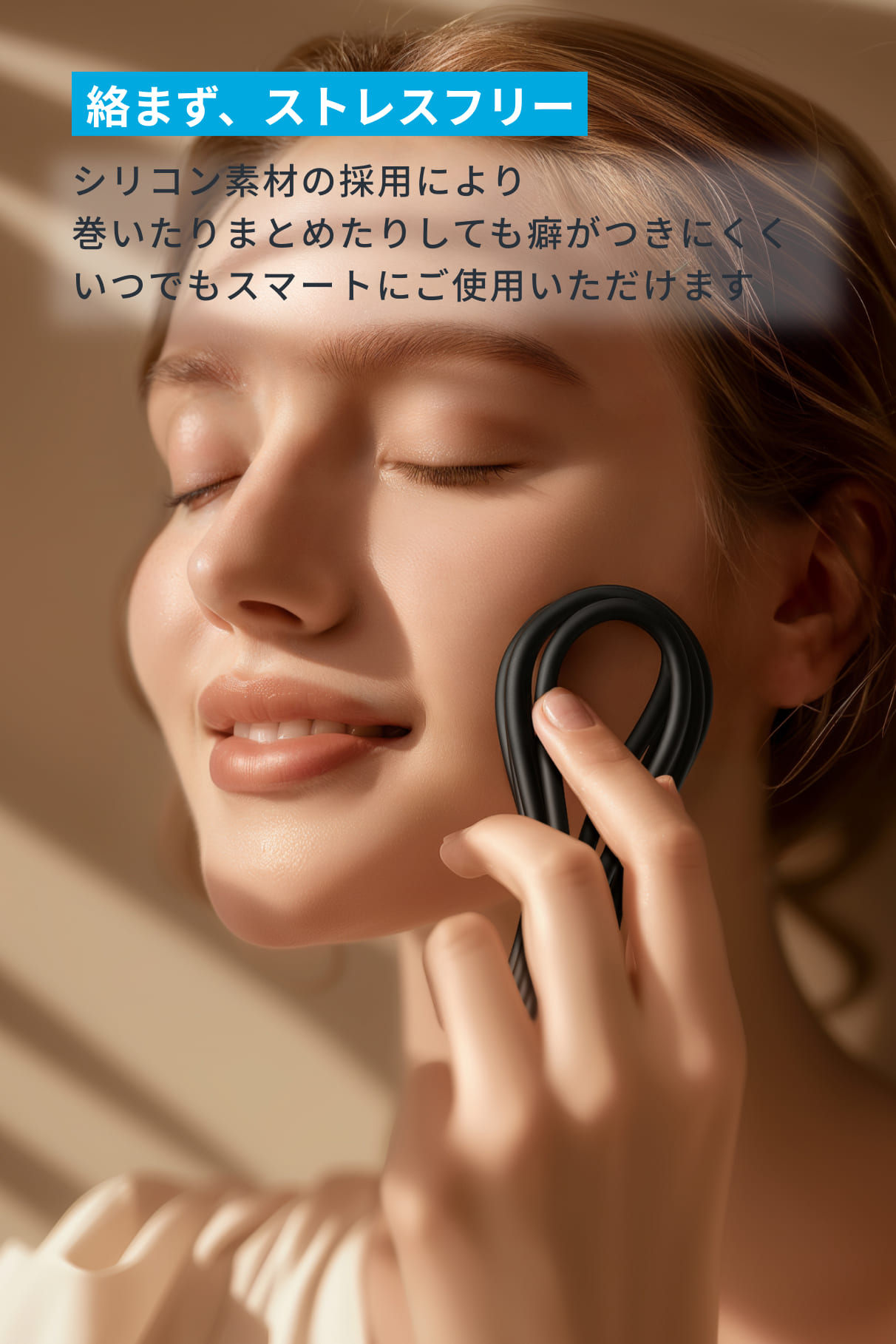 外装にシリコン素材を採用し、従来のケーブルにはない柔らかさを実現。肌に優しい使い心地をお楽しみいただけます。
