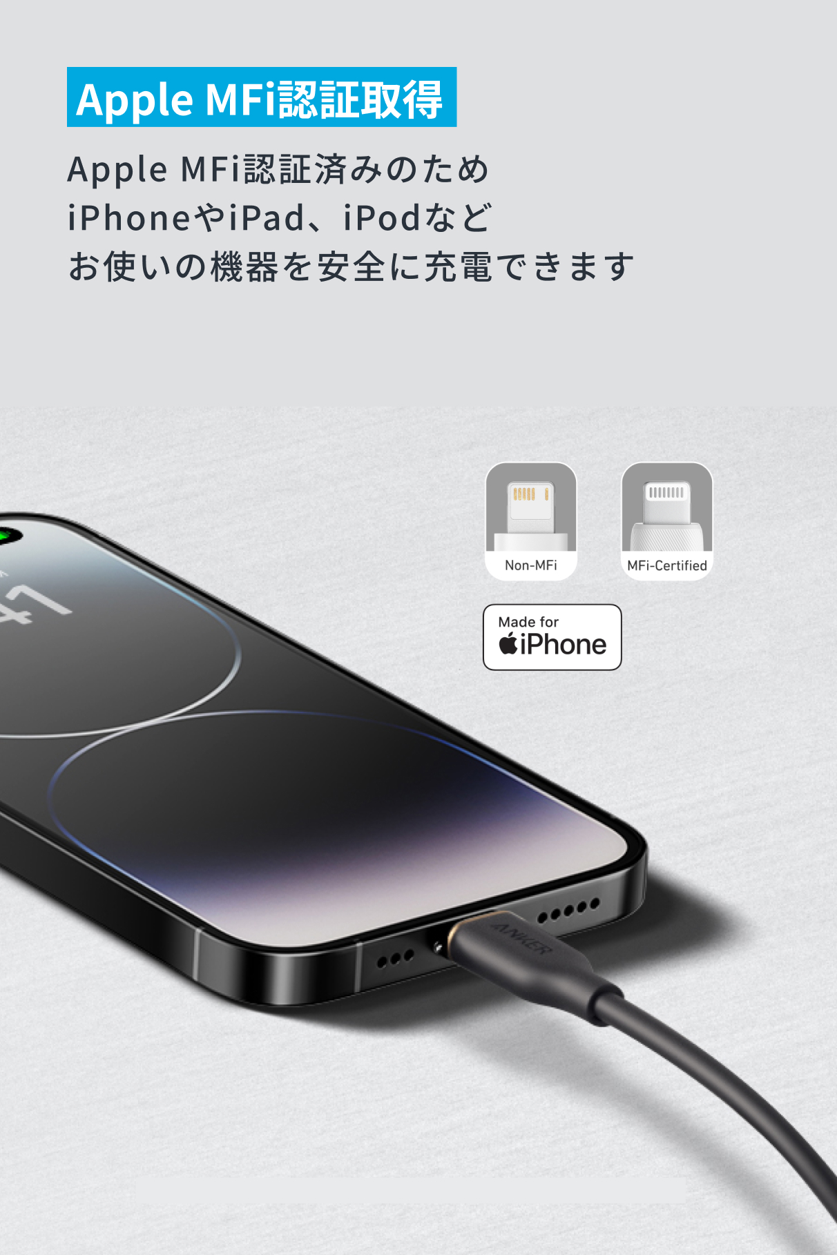 Apple MFi を取得しているため、iPhoneやiPad、iPod、その他お使いのLightning端子機器を急速充電していただけます。