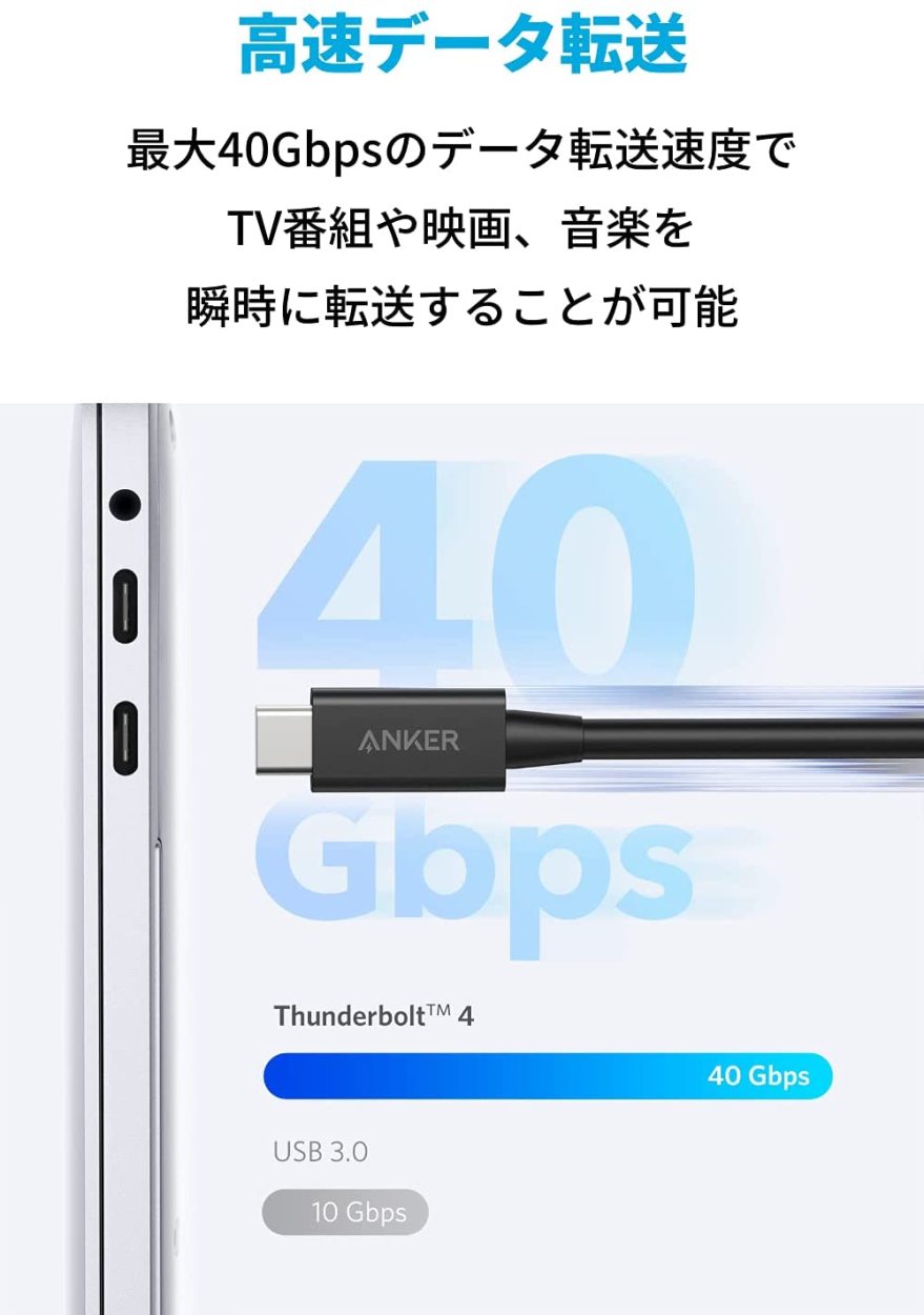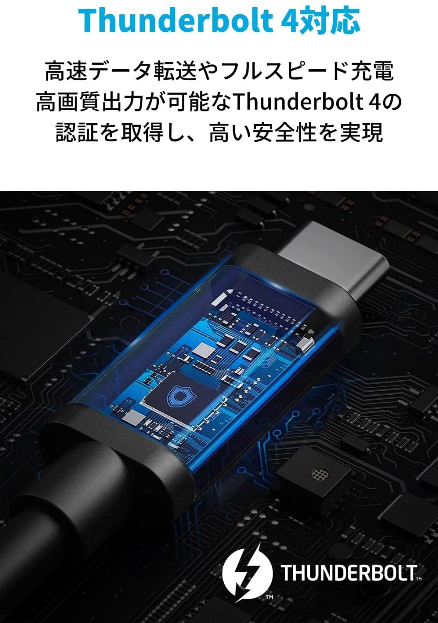 ・パッケージ内容:Anker USB-C & USB-C Thunderbolt 4 ケーブル (0.7m)、最大24ヶ月保証 (※正規販売店からの注文に限り18ヶ月保証の対象となり、条件付きで+6ヶ月の延長保証が付きます。注文番号が保証書の代わりとなります。)、カスタマーサポート