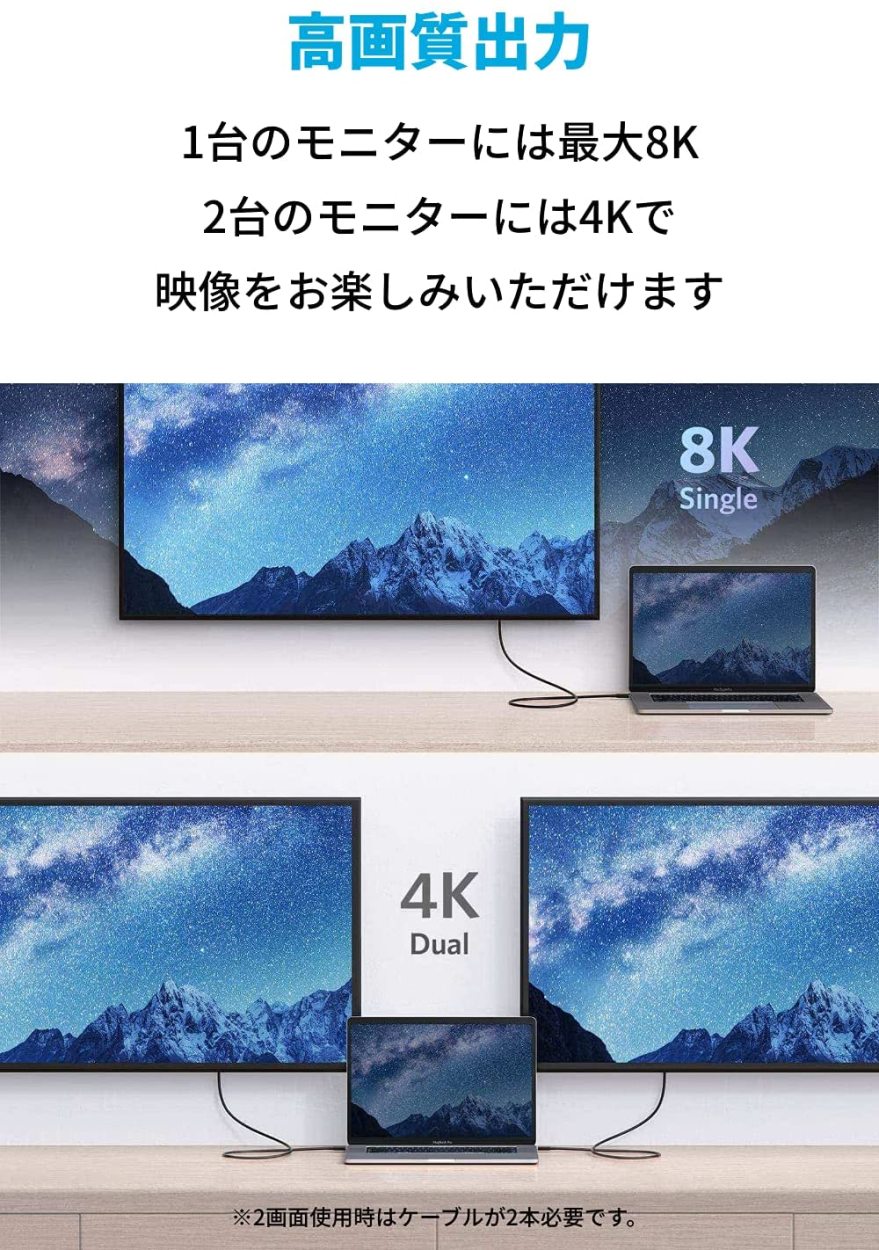 ・高画質出力:1台のモニターには最大8K、2台のモニターには4Kで映像をお楽しみいただけます。