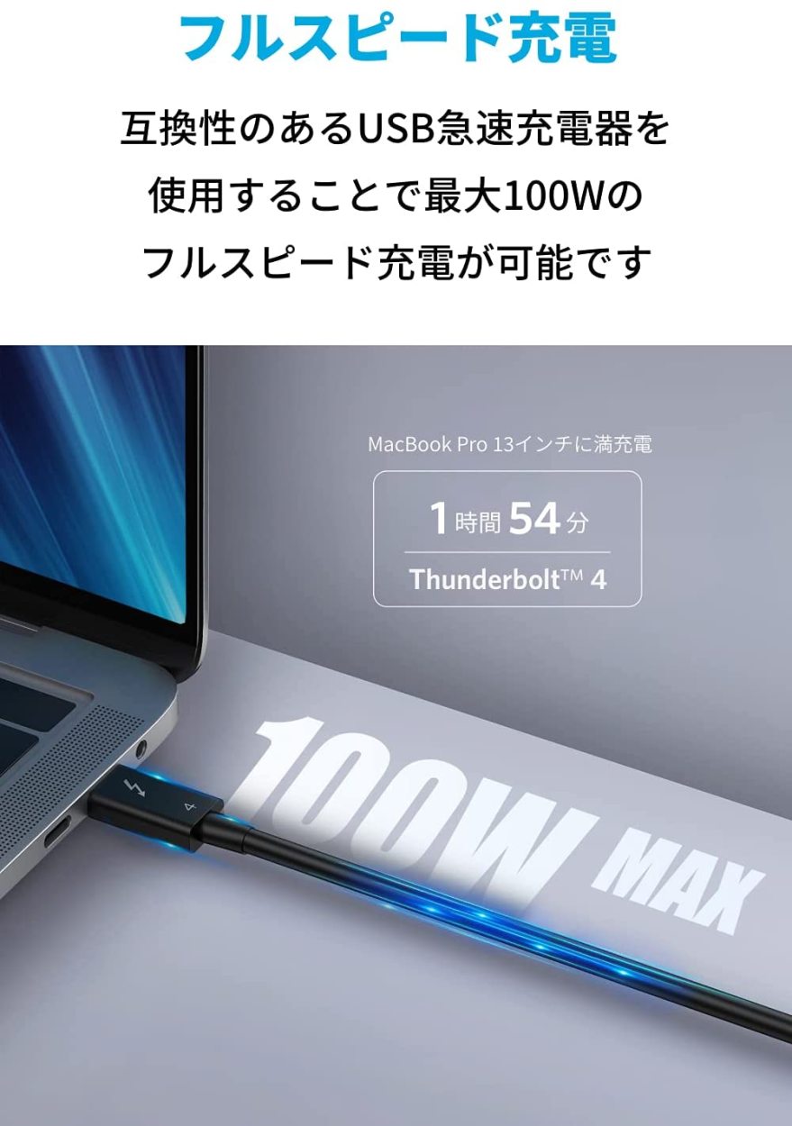 フルスピード充電や高速データ転送、8K高画質出力に対応したThunderbolt 4ケーブル