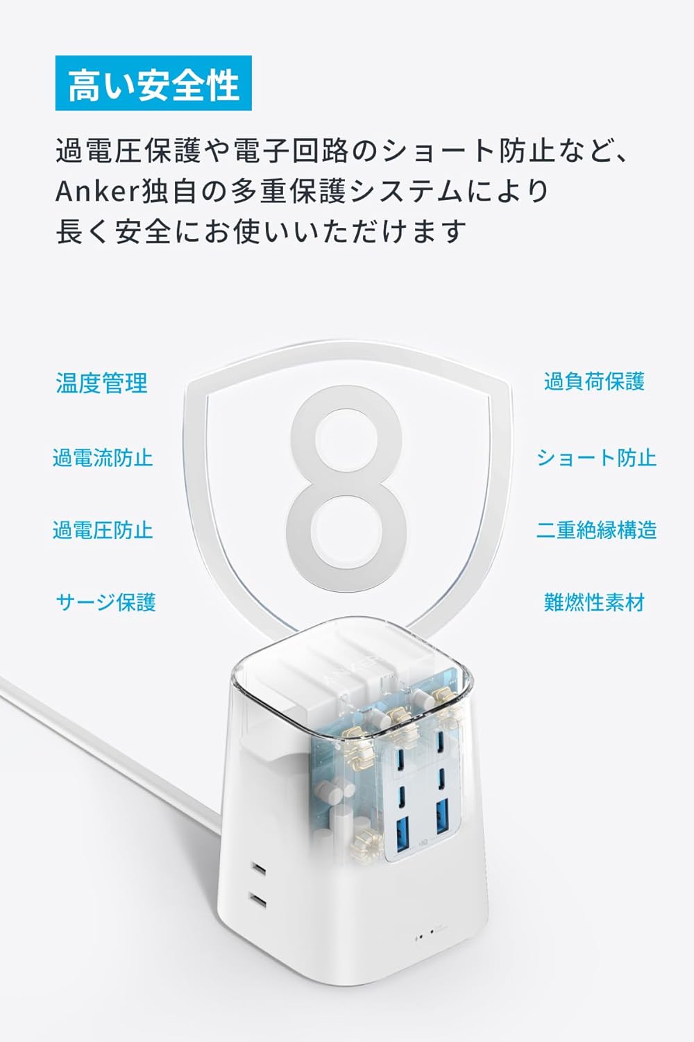 高い安全性:過電圧保護や電子回路のショート防止など、Anker独自の多重保護システムにより長く安全にお使いいただけます。
