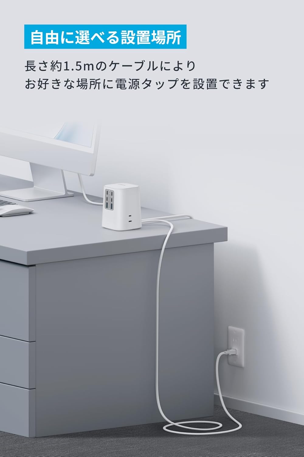 自由に選べる設置場所:長さ約1.5mのケーブルで、お好きな場所に電源タップを設置できます。