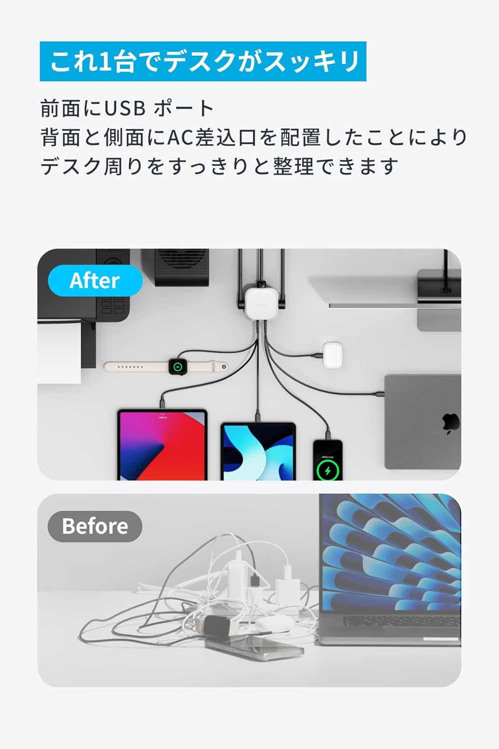・これ1台でデスクがスッキリ:前面にUSB ポート、背面 / 側面にAC差込口を配置したことにより、デスク周りをすっきりと整理できます。