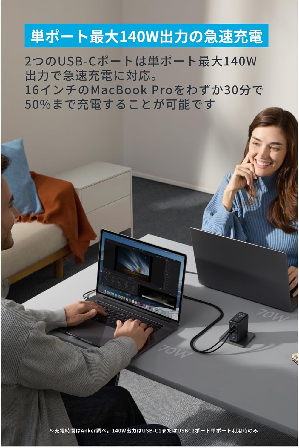 2つのUSB-Cポートは単ポート最大140W出力で急速充電に対応。16インチのMac Book Proをわずか30分で50%まで充電することが可能です。 (充電時間はAnker調べ。140W出力はUSB-C1 またはUSB-C2ポート利用時のみ)