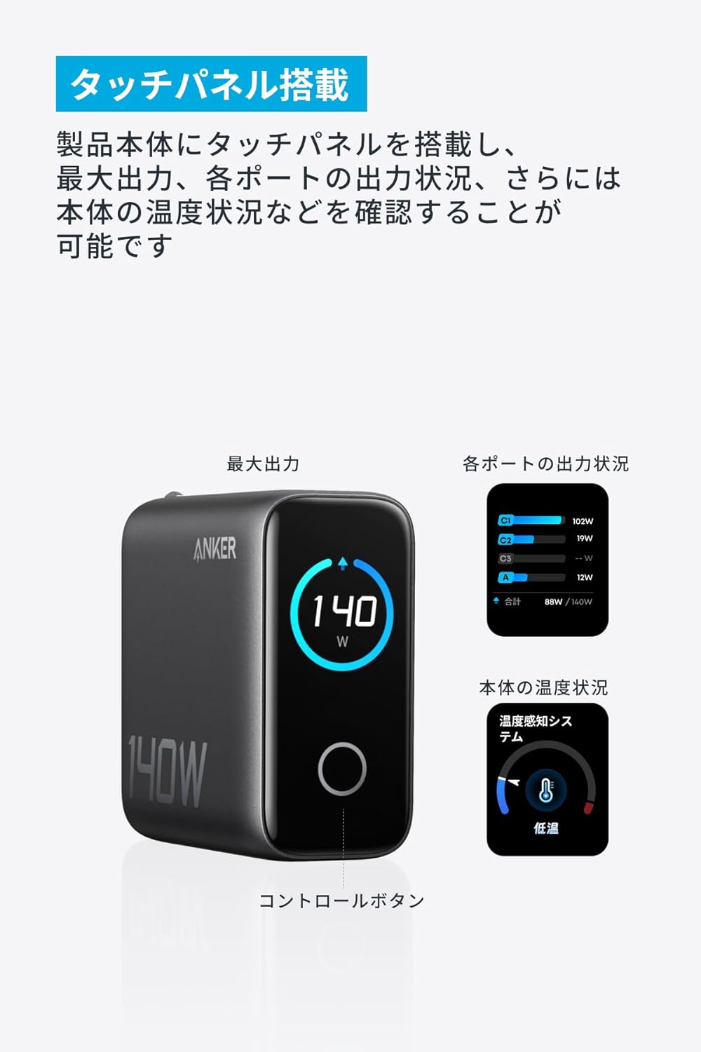 製品本体にタッチパネルを搭載し、最大出力、各ポートの出力状況、さらには本体の温度状況などを確認することが可能です。